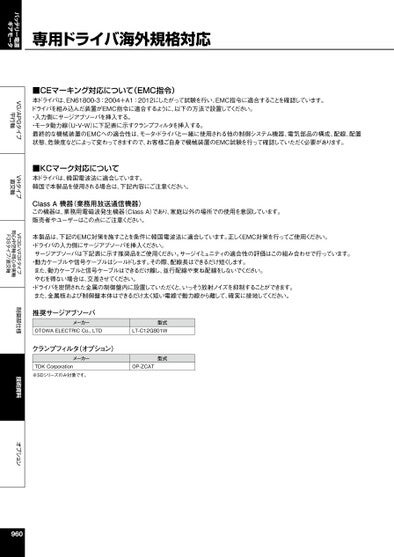 VG/APGタイプ平行軸VHタイプ直交軸VF3S/VF3Fタイプ同心中空軸・同心中実軸F3Sタイプ/直交軸制御部仕様技術資料オプションバッテリー電源ギアモータ専用ドライバ海外規格対応■CEマーキング対応について(EMC指令)本ドライバは、EN61800-3:2004+A1:2012にしたがって試験を行い、EMC指令に適合することを確認しています。ドライバを組み込んだ装置がEMC指令に適合するように、以下の方法で設置してください。・入力側にサージアブソーバを挿入する。・モータ動力線(U・V・W)に下記表に示すクランプフィルタを挿入する。最終的な機械装置のEMCへの適合性は、モータ・ドライバと一緒に使用される他の制御システム機器、電気部品の構成、配線、配置状態、危険度などによって変わってきますので、お客様ご自身で機械装置のEMC試験を行って確認していただく必要があります。■KCマーク対応について本ドライバは、韓国電波法に適合しています。韓国で本製品を使用される場合は、下記内容にご注意ください。ClassA機器(業務用放送通信機器)この機器は、業務用電磁波発生機器(ClassA)であり、家庭以外の場所での使用を意図しています。販売者やユーザーはこの点にご注意ください。本製品は、下記のEMC対策を施すことを条件に韓国電波法に適合しています。正しくEMC対策を行ってご使用ください。・ドライバの入力側にサージアブソーバを挿入ください。サージアブソーバは下記表に示す推奨品をご使用ください。サージイミュニティの適合性の評価はこの組み合わせで行っています。・動力ケーブルや信号ケーブルはシールドします。その際、配線長はできるだけ短くします。また、動力ケーブルと信号ケーブルはできるだけ離し、並行配線や束ね配線をしないでください。やむを得ない場合は、交差させてください。ドライバを密閉された金属の制御盤内に設置していただくと、いっそう放射ノイズを抑制することができます。・また、金属板および制御盤本体はできるだけ太く短い電線で動力線から離して、確実に接地してください。推奨サージアブソーバメーカーOTOWAELECTRICCo.,LTDクランプフィルタ(オプション)メーカーTDKCorporation※SDシリーズのみ対象です。型式LT-C12G801W型式OP-ZCAT960