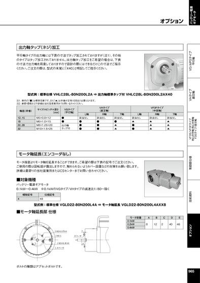 オプション技術資料制御部仕様VF3S/VF3Fタイプ同心中空軸・同心中実軸F3Sタイプ/直交軸VHタイプ直交軸VG/APGタイプ平行軸バッテリー電源ギアモータ出力軸タップ(ネジ)加工平行軸タイプの出力軸には下表の寸法でタップ加工されておりますが(注1)、その他のタイプはタップ加工されておりません。出力軸タップ加工をご希望の場合は、下表の寸法で出力軸を用意しておりますので設計の際にはできるだけこの寸法でご指示ください。ご注文の際は、型式の末尾に「X40」と明記してご指示ください。型式例:標準仕様VHLC28L-80N200L2A⇒出力軸標準タップ付VHLC28L-80N200L2AX40注1.表内の「●」は標準在庫です。また「▲」は手番が正味10日ほど必要となります。注2.納期・価格などの詳細は当社各営業所までお問い合わせください。軸径(枠番)サイズ×ピッチ×深さ(mm)VGタイプ(平行軸)12、151822、2832M5×0.8×12M6×1.0×15M8×1.25×20M10×1.5×25●●出力軸タップ付L軸該当なし●●●VHタイプ(直交軸)R軸該当なし●●●T軸該当なし●▲▲L軸該当なし▲●●VF3Fタイプ(中実軸)R軸該当なし▲▲▲T軸該当なし▲▲▲モータ軸延長(エンコーダなし)モータ後部よりモータ軸を延長することができます。ご希望の際は下表の記号でご注文ください。ご使用の際は回転部が露出しますので、触れられないようカバー設置などの対策をお願い致します。詳細は最寄りの当社営業所またはCSセンターまでお問い合わせください。■対象機種バッテリー電源ギアモータ0.1kW~0.4kW※0.1kWのVGタイプ/VHタイプの減速比1/80~除く補助記号仕様記号XX8型式例:標準仕様VGLD22-80N200L4A⇒モータ軸延長VGLD22-80N200L4AXX8■モータ軸延長部仕様モータ容量0.1kW0.2kW0.4kWABCDE81224046DE2-M3×8ボルト2-M2.52-M3×8ボルト2-スペーサスペーサACBボルトの種類はアプセットボルトです。965