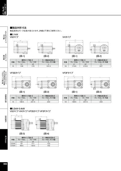 VG/APGタイプ平行軸VHタイプ直交軸VF3S/VF3Fタイプ同心中空軸・同心中実軸F3Sタイプ/直交軸制御部仕様技術資料オプションバッテリー電源ギアモータ■製品外形寸法軸延長時はモータ全長が長くなります。詳細は下表をご参照ください。●0.1kWVGタイプL2L1LVHタイプL2L1L[図-1][図-2][図-1][図-2]枠番15標準タイプ【図-1】ブレーキなしブレーキ付L1129L2170モータ軸延長【図-2】ブレーキなし/付共通L181.5枠番18標準タイプ【図-1】ブレーキなしブレーキ付L1174.5L2215.5モータ軸延長【図-2】ブレーキなし/付共通L227VF3SタイプL2L1LVF3FタイプL2L1L[図-1][図-2][図-1][図-2]枠番15標準タイプ【図-1】ブレーキなしブレーキ付L1190.5L2231.5モータ軸延長【図-2】ブレーキなし/付共通L243枠番18標準タイプ【図-1】ブレーキなしブレーキ付L1190.5L2231.5モータ軸延長【図-2】ブレーキなし/付共通L243●0.2kW・0.4kWVGタイプ・VHタイプ・VF3Sタイプ・VF3FタイプL2L1L[図-3][図-4]標準タイプ【図-3】ブレーキなしブレーキ付L16789.5L2111135.5モータ軸延長【図-4】ブレーキなし/付共通L123142枠番0.2kW0.4kW966