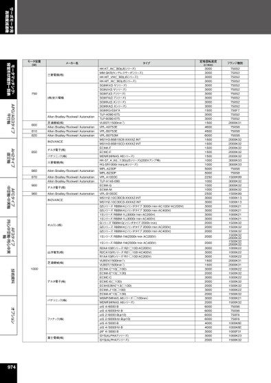 モータマッチング・容量形状種別一覧表APG/AG3タイプ平行軸AH2タイプ直交軸AFCタイプ中空軸・中実軸AF3タイプ同心中空軸・同心中実軸技術資料オプションサーボモータ用高精度減速機モータ容量(W)メーカー名7508008108208508608709009601000三菱電機(株)(株)安川電機AllenBradley/RockwellAutomation芝浦機械(株)AllenBradley/RockwellAutomationAllenBradley/RockwellAutomationAllenBradley/RockwellAutomationINOVANCEデルタ電子(株)パナソニック(株)三菱電機(株)AllenBradley/RockwellAutomationAllenBradley/RockwellAutomationAllenBradley/RockwellAutomationデルタ電子(株)AllenBradley/RockwellAutomationINOVANCEオムロン(株)山洋電気(株)芝浦機械(株)デルタ電子(株)パナソニック(株)ファナック(株)富士電機(株)タイプHK-KT_W(□80)(J5シリーズ)MM-GKR(センサレスサーボシリーズ)HK-MT_VW(□80)(J5シリーズ)HK-MT_W(□80)(J5シリーズ)SGMAV(-Ⅴシリーズ)SGMJV(-Ⅴシリーズ)SGM7J(Σ-7シリーズ)SGM7A(Σ-7シリーズ)SGMXJ(-Xシリーズ)SGMXA(-Xシリーズ)SGMXG-03A*ATLP-A090-075TLP-B090-075VLBST(1500min-1)VPL-A0753EVPL-B0753EVPL-B0753MMS1H3-85B15CB-XXXXZ-INTMS1H3-85B15CD-XXXXZ-INTECMA-FECMC-FMDMF(MINASA6シリーズ)HK-ST_4_W(□130)(J5シリーズ)(200Vアンプ時)HG-SR1000r/min(J4シリーズ)MPL-A230PMPL-B230PVPL-A1003CTLP-A145-090ECMA-GECMA-MVPL-B1003CMS1H2-10C30CB-XXXXZ-INTMS1H2-10C30CD-XXXXZ-INTG5シリーズR88M-K(シリンダタイプ3000r/minAC100V・AC200V)G5シリーズR88M-K(シリンダタイプ3000r/minAC400V)1SシリーズR88M-1L(3000r/minAC200V)1SシリーズR88M-1L(3000r/minAC400V)GシリーズR88M-G(シリンダタイプ2000r/min)G5シリーズR88M-K(シリンダタイプ2000r/minAC200V)G5シリーズR88M-K(シリンダタイプ2000r/minAC400V)1SシリーズR88M-1M(2000r/minAC200V)1SシリーズR88M-1M(2000r/minAC400V)R2AA10(Rシリーズ・R2・□100・AC200V)R2CA10(Rシリーズ・R2・□100・AC400V)R1AA10(Rシリーズ・R1・□100・AC200V)VLBSV(1500min-1)VLBST(1500min-1)ECMA-C*10(□100)ECMA-E*13(□130)ECMC-CECMC-E(□130)ECM-B3M-E*13(□130)ECMA-J*10(□100)ECMA-K*13(□130)MSMF(MINASA6シリーズ□100mm)MDMF(MINASA6シリーズ)ααααααβGYS(ALPHA7シリーズ)GYG(ALPHA7シリーズ)iS4/6000-BiS4/6000HV-BiS2/6000-B(φ10)iS2/6000HV-B(φ10)iS4/5000-BiS4/5000HV-BiF4/3000-B定格回転速度(r/min)30003000300030003000300030003000300030001500300030001500460045006000150015001500150015001000100050005000225010001000100025003000300030003000300030002000200020002000200030003000300015001500300020003000200020003000200030002000600060006000600040004000300030002000フランジ種別750S2750S2750S2750S2750S2750S2750S2750S2750S2750S2750F7750S2750S22000K31750S8750S8750S82000K322000K322000K322000K322000K323000K333000K33750S8750S81500K993000K323000K323000K321500K991000K131000K131000K211000K211000K211000K211500K321500K321500K321500K322000K321500K322000K321000K221000K221000K222000K312000K311000K221500K321000K221500K321500K321000K221500K321000K211500K32750S6750S6750F6750F61000K6E1000K6E1000F311000K231500K32974