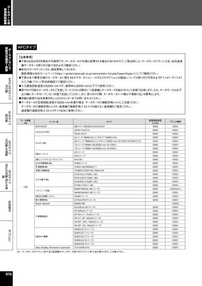 モータマッチング・容量形状種別一覧表APG/AG3タイプ平行軸AH2タイプ直交軸AFCタイプ中空軸・中実軸AF3タイプ同心中空軸・同心中実軸技術資料オプションサーボモータ用高精度減速機AFCタイプ【注意事項】●下表は2025年9月現在の代表例です。サーボモータの仕様は変更される場合がありますので、ご発注時には、サーボモータフランジ寸法、当社減速機サーボモータ取り付け部寸法を必ずご確認ください。●各社のモータマッチングは、適宜更新しております。最新情報は当社ホームページ(https://sentei.nissei-gtr.co.jp/servomotor/list.php?searchtype=1)にてご確認ください。●下表は各々標準仕様のサーボモータに関するものです。オイルシール付などのオプション仕様品については取り付け可否を必ずP.1141~P.1147の入力軸・フランジ形状詳細図でご確認ください。●入力最高回転速度は5000r/minです。通常時は3000r/min以下でご使用ください。●取り付け可能なサーボモータをご支給していただければ弊社にて減速機とサーボモータを組み付けした状態で出荷します。なお、サーボモータは必ず出力軸にキーが付いていない状態で支給してください。また、取り付けの際、サーボモータリード線は下側取り出しを標準とします。●詳細は最寄の当社営業所もしくはCSセンターまでお問い合わせください。●サーボモータの定格回転速度が3000r/min未満の場合、サーボモータの連続定格トルクにご注意ください。サーボモータの連続定格トルクが、減速機の連続定格入力トルクを超えない減速機をご選定ください。減速機の連続定格入力トルクP.1183をご参照ください。モータ容量(W)メーカー名タイプINOVANCELSELECTRICオムロン(株)(株)キーエンス(株)ジェイテクトエレクトロニクスCKD日機電装(株)芝浦機械(株)多摩川精機(株)100デルタ電子(株)パナソニック(株)(株)日立産機システム富士電機(株)BoschRexroth三菱電機(株)(株)安川電機AllenBradley/RockwellAutomationMS1H1-10B30CB-XXXXZ-INTAPMC-FAL01APEGA-A01AGシリーズR88M-G(シリンダタイプ3000r/min)G5シリーズR88M-K(シリンダタイプ3000r/minAC100V・AC200V入力)1SシリーズR88M-1M(3000r/minAC100V)1SシリーズR88M-1M(3000r/minAC200V)SVシリーズSV2シリーズKSV-B3NA80シリーズVLBSV-ZA(3000min-1)TS4603,TSM3104,TSM4104ECM-A3L-C*040(□40)ECM-A3H-C*040(□40)ECM-B3L-C*040(□40)ECMA-C*04(□40)MSMF(MINASA6シリーズ)MHMF(MINASA6シリーズ)ADMAシリーズGYS(ALPHA7シリーズ)MSM019BHG-KR(J4,JNシリーズ)HG-MR(J4シリーズ)HF-KNシリーズ(JNシリーズ)HK-KT_W(□40)(J5シリーズ)HK-MT_VW(□40)(J5シリーズ)HK-MT_W(□40)(J5シリーズ)SGMJV(-Ⅴシリーズ)SGM7J(Σ-7シリーズ)SGM7A(Σ-7シリーズ)SGMXJ(-Xシリーズ)SGMXA(-Xシリーズ)TLP-A046-010注1.サーボモータのフランジ角寸法と減速機のサーボモータ取り付けフランジ角寸法が異なります。ご注意ください。定格回転速度(r/min)300030002400300030003000300030003000300030003000300030003000300030003000300030003000-300030003000300030003000300030003000300030003000フランジ種別100S1100S1100S1100S1100S1100S1100S1100S1100S1100S1100S1100S1100S1100S1100S1100S1100S1100S3(注1)100S1100S1100S1100S3100S1100S1100S1100S1100S1100S1100S1100S1100S1100S1100S1100S1978