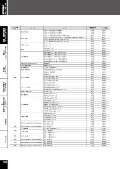 モータマッチング・容量形状種別一覧表APG/AG3タイプ平行軸AH2タイプ直交軸AFCタイプ中空軸・中実軸AF3タイプ同心中空軸・同心中実軸技術資料オプションサーボモータ用高精度減速機モータ容量(W)メーカー名タイプINOVANCEオムロン(株)(株)キーエンスKinco山洋電気(株)(株)ジェイテクトエレクトロニクスCKD日機電装(株)芝浦機械(株)多摩川精機(株)400デルタ電子(株)パナソニック(株)(株)日立産機システム富士電機(株)三菱電機(株)(株)安川電機AllenBradley/RockwellAutomationAllenBradley/RockwellAutomation三菱電機(株)ファナック(株)ファナック(株)AllenBradley/RockwellAutomationAllenBradley/RockwellAutomationAllenBradley/RockwellAutomation500500550560570590MS1H1-40B30CB-XXXXZ-INTMS1H4-40B30CB-XXXXZ-INTGシリーズR88M-G(シリンダタイプ3000r/min)G5シリーズR88M-K(シリンダタイプ3000r/minAC100V・AC200V入力)1SシリーズR88M-1M(3000r/minAC100V)1SシリーズR88M-1M(3000r/minAC200V)SVシリーズSV2シリーズSMC(G2シリーズ)SMC(G1シリーズ)R2AA06(Rシリーズ・R2・□60・AC200V)R5AA06(Rシリーズ・R5・□60・AC200V)R1AA06(Rシリーズ・R1・□60・AC200V)GAM1A6(Gシリーズ・G1・□60・AC200V)GAM2A6(Gシリーズ・G2・□60・AC200V)KSV-B3NA80シリーズVLBSV-ZA(3000min-1)TS4609,TSM3204,TSM4204ECMA-C*06(□60)ECMA-C-HECM-A3L-C*060(□60)ECM-A3H-C*060(□60)ECM-B3M-C*060(□60)ECMA-J*06(□60)MSMF(MINASA6シリーズ)MHMF(MINASA6シリーズ)MUMA042P1(200V)(MINASEシリーズ)ADMAシリーズGYS(ALPHA7シリーズ)GYB(ALPHA7シリーズ)HG-KR(J4,JNシリーズ)HG-MR(J4シリーズ)HF-KNシリーズ(JNシリーズ)HK-KT_W(□60)(J5シリーズ)MM-GKR(センサレスサーボシリーズ)HK-MT_VW(□60)(J5シリーズ)HK-MT_W(□60)(J5シリーズ)SGM7J(Σ-7シリーズ)SGM7A(Σ-7シリーズ)SGMXJ(-Xシリーズ)SGMXA(-Xシリーズ)TLP-A070-040TLP-B070-040VPL-A0633FHG-SR1000r/min(J4シリーズ)ββββVPL-A1001CVPL-B0633MVPL-B0633TVPL-A0753CiS1/6000-BiS1/6000HV-BiS1.5/6000-BiS1.5/6000HV-B定格回転速度(r/min)300030003000300030003000300030003000300030003000300040004000300030003000300030003000300030003000300030003000300030003000300030003000300030003000300030003000300030003000300030004500100060006000600060002800650065003300フランジ種別400S1400S1400S3400S3400S3400S3400S1400S1400S1400S1400S1400S1400S1400S1400S1400S1400S1400S1400S1400S1400S1400S1400S1400S1400S1400S3400S3400S3400S1400S1400S1400S1400S1400S1400S1400S1400S1400S1400S1400S1400S1400S1400S1400S1400S62000K33400S1400S1400S1400S1750S9400S6400S6750SA980