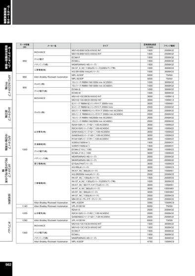 モータマッチング・容量形状種別一覧表APG/AG3タイプ平行軸AH2タイプ直交軸AFCタイプ中空軸・中実軸AF3タイプ同心中空軸・同心中実軸技術資料オプションサーボモータ用高精度減速機タイプMS1H3-85B15CB-XXXXZ-INTMS1H3-85B15CD-XXXXZ-INTECMA-FECMA-LMGMF(MINASA6シリーズ)HK-ST_4_W(□130)(J5シリーズ)(200Vアンプ時)HG-SR1000r/min(J4シリーズ)MPL-A230PMPL-B230P1SシリーズR88M-1M(1000r/minAC200V)1SシリーズR88M-1M(1000r/minAC400V)ECMA-GECMA-MMS1H2-10C30CB-XXXXZ-INTMS1H2-10C30CD-XXXXZ-INTGシリーズR88M-G(シリンダタイプ3000r/min)GシリーズR88M-G(シリンダタイプ2000r/min)G5シリーズR88M-K(シリンダタイプ2000r/minAC200V)G5シリーズR88M-K(シリンダタイプ2000r/minAC400V)1SシリーズR88M-1M(2000r/minAC200V)1SシリーズR88M-1M(2000r/minAC400V)R2AA10(Rシリーズ・R2・□100・AC200V)R2CA10(Rシリーズ・R2・□100・AC400V)GAM1AA(Gシリーズ・G1・□100・AC200V)GAM2AA(Gシリーズ・G2・□100・AC200V)R1AA10(Rシリーズ・R1・□100・AC200V)VLBSV(1500min-1)VLBST(1500min-1)ECMA-C*10(□100)ECMA-J*10(□100)MDMF(MINASA6シリーズ)MHMF(MINASA6シリーズ)GYS(ALPHA7シリーズ)HG-RR(J4シリーズ)HK-KT_W(□90)(J5シリーズ)HG-SR2000r/min(J4シリーズ)HK-ST_W(□130)(J5シリーズ)HK-ST_4_W(□130)(J5シリーズ)(200Vアンプ時)HK-KT_W(□90フラットタイプ)(J5シリーズ)HK-RT_4_W(□90)(J5シリーズ)HK-RT_W(□90)(J5シリーズ)HK-ST_W(□130)(J5シリーズ)MM-CF(センサレスサーボシリーズ)MPL-A320HVPL-B1001MR2AA13R2CA13(Rシリーズ・R2・□130・AC400V)GAM2AB(Gシリーズ・G2・□130・AC200V)VPL-A1001MMS1H3-13C15CB-XXXXZ-INTMS1H3-13C15CD-XXXXZ-INTECMA-FECMA-LMGMF(MINASA6シリーズ)MPL-A320Pモータ容量(W)メーカー名850INOVANCEデルタ電子パナソニック(株)三菱電機(株)860AllenBradley/RockwellAutomation9001000オムロン(株)デルタ電子(株)INOVANCEオムロン(株)山洋電気(株)芝浦機械(株)デルタ電子(株)パナソニック(株)富士電機(株)三菱電機(株)1140AllenBradley/RockwellAutomationAllenBradley/RockwellAutomation1200山洋電気(株)1290AllenBradley/RockwellAutomationINOVANCE1300デルタ電子(株)パナソニック(株)AllenBradley/RockwellAutomation982定格回転速度(r/min)1500150015001500150010001000500050001000100010001000300030003000200020002000200020003000300030003000300015001500300030002000200030003000300020001500100030003000300020002000335060002000200020006500150015001500150015004750フランジ種別2000K322000K322000K322000K322000K323000K333000K33750SA750SA3000K323000K323000K323000K321000K131000K131000K612000K322000K322000K322000K322000K321000K221000K221000K221000K221000K222000K312000K311000K221000K222000K322000K321000K231000K231000K612000K332000K333000K331000K611000W611000W612000K332000K331000KC9750S92000K322000K322000K32750S93000K323000K323000K323000K323000K321000KC9