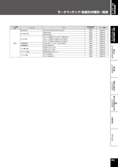モータマッチング・容量形状種別一覧表オプション技術資料AF3タイプ同心中空軸・同心中実軸AFCタイプ中空軸・中実軸AH2タイプ直交軸APG/AG3タイプ平行軸モータマッチング・容量形状種別一覧表サーボモータ用高精度減速機モータ容量(W)メーカー名3000INOVANCELSELECTRICオムロン(株)山洋電気(株)芝浦機械(株)デルタ電子(株)パナソニック(株)ファナック(株)タイプMS1H2-30C30CD-XXXXZ(-S4)-INTAPM-FF30AAPM-FFP30AGシリーズR88M-G(シリンダタイプ3000r/min)1SシリーズR88M-1L(3000r/minAC200V)1SシリーズR88M-1L(3000r/minAC400V)R1AA13(Rシリーズ・R1・□130・AC200V)VLBSV(3000min-1)ECMA-C*13(□130)ECMA-J*13(□130)MSMF(MINASA6シリーズ)ααiF12/4000-BiF12/4000HV-B定格回転速度(r/min)3000300030003000300030003000300030003000300030003000フランジ種別3000K343000K753000K753000K523000K323000K323000K343000K753000K333000K333000K323000K753000K75985