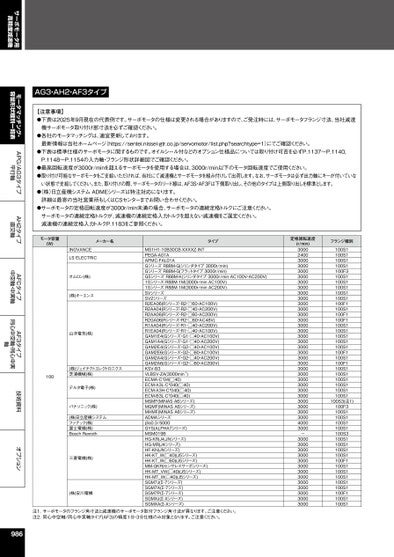 モータマッチング・容量形状種別一覧表APG/AG3タイプ平行軸AH2タイプ直交軸AFCタイプ中空軸・中実軸AF3タイプ同心中空軸・同心中実軸技術資料オプションサーボモータ用高精度減速機AG3・AH2・AF3タイプ【注意事項】●下表は2025年9月現在の代表例です。サーボモータの仕様は変更される場合がありますので、ご発注時には、サーボモータフランジ寸法、当社減速機サーボモータ取り付け部寸法を必ずご確認ください。●各社のモータマッチングは、適宜更新しております。最新情報は当社ホームページ(https://sentei.nissei-gtr.co.jp/servomotor/list.php?searchtype=1)にてご確認ください。●下表は標準仕様のサーボモータに関するものです。オイルシール付などのオプション仕様品については取り付け可否を必ずP.1137~P.1140,P.1148~P.1154の入力軸・フランジ形状詳細図でご確認ください。●最高回転速度が3000r/minを超えるサーボモータを使用する場合は、3000r/min以下のモータ回転速度でご使用ください。●取り付け可能なサーボモータをご支給いただければ、当社にて減速機とサーボモータを組み付けして出荷します。なお、サーボモータは必ず出力軸にキーが付いていない状態で支給してください。また、取り付けの際、サーボモータのリード線は、AF3S・AF3Fは下側取り出し、その他のタイプは上側取り出しを標準とします。●(株)日立産機システムADMEシリーズは特注対応になります。詳細は最寄の当社営業所もしくはCSセンターまでお問い合わせください。●サーボモータの定格回転速度が3000r/min未満の場合、サーボモータの連続定格トルクにご注意ください。サーボモータの連続定格トルクが、減速機の連続定格入力トルクを超えない減速機をご選定ください。減速機の連続定格入力トルクP.1183をご参照ください。モータ容量(W)メーカー名INOVANCELSELECTRICオムロン(株)(株)キーエンス山洋電気(株)(株)ジェイテクトエレクトロニクス芝浦機械(株)100デルタ電子(株)パナソニック(株)(株)日立産機システムファナック(株)富士電機(株)BoschRexroth三菱電機(株)(株)安川電機タイプMS1H1-10B30CB-XXXXZ-INTPEGA-A01AAPMC-FAL01AGシリーズR88M-G(シリンダタイプ3000r/min)GシリーズR88M-G(フラットタイプ3000r/min)G5シリーズR88M-K(シリンダタイプ3000r/minAC100V・AC200V)1SシリーズR88M-1M(3000r/minAC100V)1SシリーズR88M-1M(3000r/minAC200V)SVシリーズSV2シリーズR2EA06(Rシリーズ・R2・□60・AC100V)R2AA04(Rシリーズ・R2・□40・AC200V)R2AA06(Rシリーズ・R2・□60・AC200V)R2GA06(Rシリーズ・R2・□60・AC48V)R1AA04(Rシリーズ・R1・□40・AC200V)R1EA04(Rシリーズ・R1・□40・AC100V)GAM1E4(Gシリーズ・G1・□40・AC100V)GAM1A4(Gシリーズ・G1・□40・AC200V)GAM2E4(Gシリーズ・G2・□40・AC100V)GAM2E6(Gシリーズ・G2・□60・AC100V)GAM2A4(Gシリーズ・G2・□40・AC200V)GAM2A6(Gシリーズ・G2・□60・AC200V)KSV-B3VLBSV-ZA(3000min-1)ECMA-C*04(□40)ECM-A3L-C*040(□40)ECM-A3H-C*040(□40)ECM-B3L-C*040(□40)MSMF(MINASA6シリーズ)MQMF(MINASA6シリーズ)MHMF(MINASA6シリーズ)ADMAシリーズβis0.3/5000GYS(ALPHA7シリーズ)MSM019BHG-KR(J4,JNシリーズ)HG-MR(J4シリーズ)HF-KN(JNシリーズ)HK-KT_W(□40)(J5シリーズ)HK-KT_W(□60)(J5シリーズ)MM-GKR(センサレスサーボシリーズ)HK-MT_VW(□40)(J5シリーズ)HK-MT_W(□40)(J5シリーズ)SGM7J(Σ-7シリーズ)SGM7A(Σ-7シリーズ)SGM7P(Σ-7シリーズ)SGMXJ(-Xシリーズ)SGMXA(-Xシリーズ)注1.サーボモータのフランジ角寸法と減速機のサーボモータ取付フランジ角寸法が異なります。ご注意ください。注2.同心中空軸/同心中実軸タイプ(AF3)の精度1分・3分仕様のみ対象となります。ご注意ください。986定格回転速度(r/min)3000240030003000300030003000300030003000300030003000300030003000300030003000300030003000300030003000300030003000300030003000300040003000-3000300030003000300030003000300030003000300030003000フランジ種別100S1100S1100S1100S1100F3100S1100S1100S1100S1100S1100F1100S1100F1100F1100S1100S1100S1100S1100S1100F1100S1100F1100S1100S1100S1100S1100S1100S1100F3100S1100S1100S1100S1100S3100S1100S1100S1100S1100F1100S1100S1100S1100S1100S1100F1100S1100S1100S3(注1)