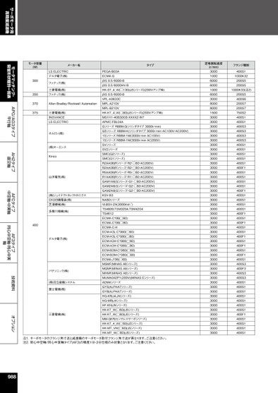 モータマッチング・容量形状種別一覧表APG/AG3タイプ平行軸AH2タイプ直交軸AFCタイプ中空軸・中実軸AF3タイプ同心中空軸・同心中実軸技術資料オプションサーボモータ用高精度減速機モータ容量(W)メーカー名タイプ300350370375LSELECTRICデルタ電子(株)ファナック(株)三菱電機(株)ファナック(株)AllenBradley/RockwellAutomation三菱電機(株)INOVANCELSELECTRICオムロン(株)(株)キーエンスKinco山洋電気(株)(株)ジェイテクトエレクトロニクスCKD日機電装(株)芝浦機械(株)多摩川精機(株)400デルタ電子(株)パナソニック(株)(株)日立産機システム富士電機(株)三菱電機(株)iS0.5/6000-BiS0.5/6000-BiS0.5/6000HV-BPEGA-B03AECMA-GββHK-ST_4_W(□130)(J5シリーズ)(200Vアンプ時)βVPL-A0633CMPL-A210VMPL-B210VHK-KT_4_W(□80)(J5シリーズ)(200Vアンプ時)MS1H1-40B30CB-XXXXZ-INTAPMC-FBL04AGシリーズR88M-G(シリンダタイプ3000r/min)G5シリーズR88M-K(シリンダタイプ3000r/minAC100V・AC200V)1SシリーズR88M-1M(3000r/minAC100V)1SシリーズR88M-1M(3000r/minAC200V)SVシリーズSV2シリーズSMC(G2シリーズ)SMC(G1シリーズ)R2AA06(Rシリーズ・R2・□60・AC200V)R2AA08(Rシリーズ・R2・□80・AC200V)R5AA06(Rシリーズ・R5・□60・AC200V)R1AA06(Rシリーズ・R1・□60・AC200V)GAM1A6(Gシリーズ・G1・□60・AC200V)GAM2A6(Gシリーズ・G2・□60・AC200V)GAM2A8(Gシリーズ・G2・□80・AC200V)KSV-B3NA80シリーズVLBSV-ZA(3000min-1)TS4609,TSM3204,TSM4204TS4612ECMA-C*06(□60)ECMA-C*08(□80)ECMA-C-HECM-A3L-C*060(□60)ECM-A3L-C*080(□80)ECM-A3H-C*060(□60)ECM-A3H-C*080(□80)ECM-B3M-C*060(□60)ECM-B3M-C*080(□80)ECMA-J*06(□60)MSMF(MINASA6シリーズ)MQMF(MINASA6シリーズ)MHMF(MINASA6シリーズ)MUMA042P1(200V)(MINASEシリーズ)ADMAシリーズGYS(ALPHA7シリーズ)GYB(ALPHA7シリーズ)HG-KR(J4,JNシリーズ)HG-MR(J4シリーズ)HF-KN(JNシリーズ)HK-KT_W(□60)(J5シリーズ)HK-KT_W(□80)(J5シリーズ)MM-GKR(センサレスサーボシリーズ)HK-KT_4_W(□60)(J5シリーズ)HK-MT_VW(□60)(J5シリーズ)HK-MT_W(□60)(J5シリーズ)定格回転速度(r/min)3000100060006000100060003000800080001500300030003000300030003000300030003000300030003000300030003000300030003000300030003000300030003000300030003000300030003000300030003000300030003000300030003000300030003000300030003000300030003000フランジ種別400S11000K32200S5200S51000K33(注2)200S5400S6200S7200S7750S2400S1400S1400S3400S3400S3400S3400S1400S1400S1400S1400S1400F1400S1400S1400S1400S1400F1400S1400S1400S1400S1400F1400S1400F1400S1400S1400F1400S1400F1400S1400F1400S1400S3400F3400S3400S3400S1400S1400S1400S1400S1400S1400S1400F1400S1400S1400S1400S1注1.サーボモータのフランジ角寸法と減速機のサーボモータ取付フランジ角寸法が異なります。ご注意ください。注2.同心中空軸/同心中実軸タイプ(AF3)の精度1分・3分仕様のみ対象となります。ご注意ください。988