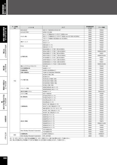 モータマッチング・容量形状種別一覧表APG/AG3タイプ平行軸AH2タイプ直交軸AFCタイプ中空軸・中実軸AF3タイプ同心中空軸・同心中実軸技術資料オプションサーボモータ用高精度減速機モータ容量(W)メーカー名タイプINOVANCELSELECTRICオムロン(株)(株)キーエンスKinco山洋電気(株)(株)ジェイテクトエレクトロニクスCKD日機電装(株)芝浦機械(株)多摩川精機(株)750デルタ電子(株)パナソニック(株)(株)日立産機システムファナック(株)富士電機(株)三菱電機(株)(株)安川電機AllenBradley/RockwellAutomation800芝浦機械(株)AllenBradley/RockwellAutomationMS1H1-75B30CB-XXXXZ-INTAPMC-FCL08AGシリーズR88M-G(シリンダタイプ3000r/min)G5シリーズR88M-K(シリンダタイプ3000r/minAC100V・AC200V)1SシリーズR88M-1M(3000r/minAC200V)SVシリーズSV2シリーズSMC(G2シリーズ)SMC(G1シリーズ)R2AA08(Rシリーズ・R2・□80・AC200V)R2AA10(Rシリーズ・R2・□100・AC200V)R5AA08(Rシリーズ・R5・□80・AC200V)R2CA10(Rシリーズ・R2・□100・AC400V)R1AA08(Rシリーズ・R1・□80・AC200V)GAM1A8(Gシリーズ・G1・□80・AC200V)GAM2A8(Gシリーズ・G2・□80・AC200V)GAM2AA(Gシリーズ・G2・□100・AC200V)KSV-B3NA80シリーズVLBSV-ZA(3000min-1)TS4614,TSM3304,TSM4304ECMA-C*08(□80)ECMA-C-HECM-A3L-C*080(□80)ECM-A3H-C*080(□80)ECM-B3M-C*080(□80)ECMA-J*08(□80)MSMF(MINASA6シリーズ)MHMF(MINASA6シリーズ)ADMAシリーズβiS4/4000-BGYS(ALPHA7シリーズ)GYB(ALPHA7シリーズ)HG-KR(J4,JNシリーズ)HG-MR(J4シリーズ)HK-KT_W(□80)(J5シリーズ)HK-KT_4_W(□80)(J5シリーズ)MM-GKR(センサレスサーボシリーズ)HK-MT_VW(□80)(J5シリーズ)HK-MT_W(□80)(J5シリーズ)SGM7J(Σ-7シリーズ)SGM7A(Σ-7シリーズ)SGM7P(Σ-7シリーズ)SGMXP(-Xシリーズ)SGMXP(-Xシリーズ)SGMXJ(-Xシリーズ)SGMXA(-Xシリーズ)TLP-A090-075TLP-B090-075VLBST(1500min-1)VPL-A0753E注1.サーボモータのフランジ角寸法と減速機のサーボモータ取付フランジ角寸法が異なります。ご注意ください。注2.同心中空軸/同心中実軸タイプ(AF3)の精度1分・3分仕様のみ対象となります。ご注意ください。定格回転速度(r/min)300030003000300030003000300030003000300030003000300030003000300030003000300030003000300030003000300030003000300030003000300030003000300030003000300030003000300030003000300030003000300030003000300015004600フランジ種別750S2750S2750S3750S3750S3750S2750S2750S2750S2750S11000K22(注2)750S11000K22(注2)750S1750S1750S11000K22(注2)750S2750S2750S2750S2750S2750S2750S2750S2750S2750S2750S3750S3750S2(注1)750S6750S1750S2750S2750S2750S2750S2750S2750S2750S2750S2750S2750F2750F21000K31(注2)750S2750S2750S2750S22000K31750SA990