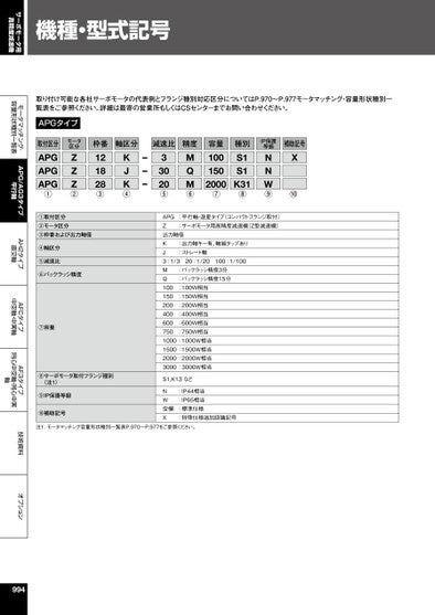 サーボモータ用高精度減速機モータマッチング・容量形状種別一覧表APG/AG3タイプ平行軸AH2タイプ直交軸AFCタイプ中空軸・中実軸AF3タイプ同心中空軸・同心中実軸技術資料オプション取り付け可能な各社サーボモータの代表例とフランジ種別対応区分についてはP.970~P.977モータマッチング・容量形状種別一覧表をご参照ください。詳細は最寄の営業所もしくはCSセンターまでお問い合わせください。IP保護等級補助記号X⑩NNW⑨種別S1S1K31⑧取付区分モータ区分枠番軸区分減速比精度容量1001502000⑦MQM⑥33020⑤KJK④121828③ZZZ②APGAPGAPG①APGタイプ機種・型式記号①取付区分②モータ区分③枠番および出力軸径④軸区分⑤減速比⑥バックラッシ精度⑦容量:バックラッシ精度3分:バックラッシ精度15分:出力軸キー有、軸端タップあり:ストレート軸APG:平行軸・遊星タイプ(コンパクトフランジ取付)Z:サーボモータ用高精度減速機(Z型減速機)出力軸径KJ3:1/320:1/20100:1/100MQ100:100W相当150:150W相当200:200W相当400:400W相当600:600W相当750:750W相当1000:1000W相当1500:1500W相当2000:2000W相当3000:3000W相当⑧サーボモータ取付フランジ種別(注1)⑨IP保護等級⑩補助記号S1,K13などN:IP44相当W:IP65相当空欄:標準仕様X:特殊仕様追加認識記号注1.モータマッチング容量形状種別一覧表P.970~P.977をご参照ください。994