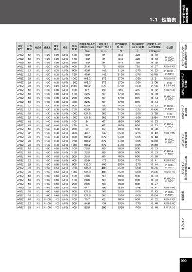 1-1.性能表サーボモータ用高精度減速機オプション技術資料AF3タイプ同心中空軸・同心中実軸AFCタイプ中空軸・中実軸AH2タイプ直交軸APG/AG3タイプ平行軸モータマッチング・容量形状種別一覧表取付区分出力軸径軸区分減速比APGZAPGZAPGZAPGZAPGZAPGZAPGZAPGZAPGZAPGZAPGZAPGZAPGZAPGZAPGZAPGZAPGZAPGZAPGZAPGZAPGZAPGZAPGZAPGZAPGZAPGZAPGZAPGZAPGZAPGZAPGZAPGZAPGZAPGZAPGZAPGZAPGZAPGZAPGZAPGZ12121218222228282812181818222228281818182228282818181822282828181818222828182228K/JK/JK/JK/JK/JK/JK/JK/JK/JK/JK/JK/JK/JK/JK/JK/JK/JK/JK/JK/JK/JK/JK/JK/JK/JK/JK/JK/JK/JK/JK/JK/JK/JK/JK/JK/JK/JK/JK/JK/J1/201/201/201/201/201/201/201/201/201/301/301/301/301/301/301/301/301/401/401/401/401/401/401/401/501/501/501/501/501/501/501/601/601/601/601/601/601/1001/1001/100実減速比1/201/201/201/201/201/201/201/201/201/301/301/301/301/301/301/301/301/401/401/401/401/401/401/401/501/501/501/501/501/501/501/601/601/601/601/601/601/1001/1001/100精度M/QM/QM/QM/QM/QM/QM/QM/QM/QM/QM/QM/QM/QM/QM/QM/QM/QM/QM/QM/QM/QM/QM/QM/QM/QM/QM/QM/QM/QM/QM/QM/QM/QM/QM/QM/QM/QM/QM/QM/Q相当容量1001502004006007501000150020001001502004006007501000150010015020040060075010001001502004006007501000100150200400600750100200400許容平均トルク(3000r/min)起動・停止許容ピークトルク出力軸許容O.H.L.出力軸許容スラスト荷重N・m10.210.210.221.640.640.6108.2108.2108.26.732.532.532.560.960.9121.8121.819.119.119.140.7108.2108.2108.225.525.525.550.9135.3135.3135.328.628.628.661.1121.8121.820.744.695.5N・m313131761421423793793792097979718318336536567676714237937937989898917840640640693939318936536562134286N840840840157021502150270027002700910175017501750245024503100310018601860186025503450345034501860186018602550255035203520186018601860255035203520186025503520N4204204207851075107513501350135045587587587512251225155015509309309301275172517251725930930930127512751760176093093093012751760176093012751760内部慣性モーメント(入力軸換算)×10-4kg・m20.1330.1330.1280.1370.1920.6752.7512.7062.7060.1320.1390.1340.1340.1830.6662.7282.6840.1330.1330.1280.1430.1480.6602.6100.1330.1330.1280.1410.1440.6562.6060.1330.1330.1270.1410.1430.6540.1320.1400.140寸法図P.1002,P.1003P.1004~P.1007P.1008~P.1010P.1014,P.016~P.1018P.1014,P.1016~P.1018P.1002,P.1003P.1004~P.1007P.1008~P.1010P.1014,P.1016~P.1018P.1004~P.1007P.1008~P.1010P.1013,P.1015P.1004~P.1007P.1008~P.1010P.1013,P.1015P.1014,P.016~P.1018P.1004~P.1007P.1008~P.1010P.1013,P.1015P.1004~P.1007P.1008~P.1010P.1013,P.1015999