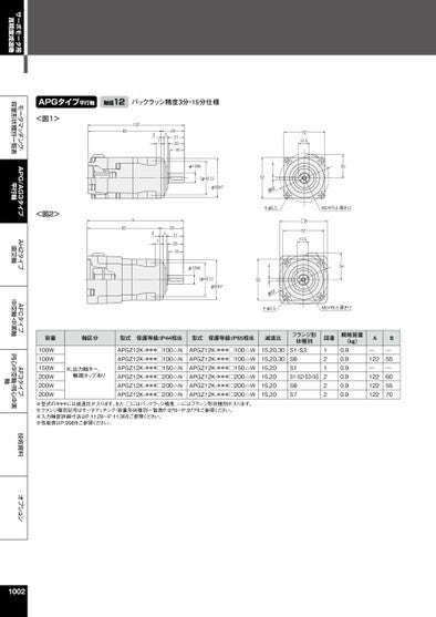 サーボモータ用高精度減速機モータマッチング・容量形状種別一覧表APG/AG3タイプ平行軸AH2タイプ直交軸AFCタイプ中空軸・中実軸AF3タイプ同心中空軸・同心中実軸技術資料オプションAPGタイプ平行軸軸径12バックラッシ精度3分・15分仕様<図1><図2>1229335729212018A93357292120185213.530φ12h6(φ42.5)φ50h752426φ4-φ5.5M5×P0.8深さ12□B5213.5φ12h6(φ42.5)φ50h752426φ4-φ5.534M5×P0.8深さ12容量軸区分型式保護等級:IP44相当型式保護等級:IP65相当減速比100W100W150W200W200W200WK:出力軸キー、軸端タップありAPGZ12K-***□100△NAPGZ12K-***□100△NAPGZ12K-***□150△NAPGZ12K-***□200△NAPGZ12K-***□200△NAPGZ12K-***□200△NAPGZ12K-***□100△WAPGZ12K-***□100△WAPGZ12K-***□150△WAPGZ12K-***□200△WAPGZ12K-***□200△WAPGZ12K-***□200△W15,20,3015,20,3015,2015,2015,2015,20フランジ形状種別S1・S3S6S1S1・S2・S3・S5S6S7図番概略質量(kg)AB1212220.90.90.90.90.90.9―122―122122122―55―605570※型式の***には減速比が入ります。また、□にはバックラッシ精度、△にはフランジ形状種別が入ります。※フランジ種別記号はモータマッチング・容量形状種別一覧表P.970~P.977をご参照ください。※入力軸部詳細寸法はP.1128~P.1136をご参照ください。※性能表はP.998をご参照ください。1002