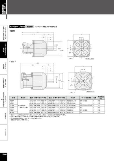 サーボモータ用高精度減速機モータマッチング・容量形状種別一覧表APG/AG3タイプ平行軸AH2タイプ直交軸AFCタイプ中空軸・中実軸AF3タイプ同心中空軸・同心中実軸技術資料オプションAPGタイプ平行軸軸径18バックラッシ精度3分・15分仕様<図1><図2>152.5107.5459510313027152.5107.55104593130277820.57820.5M6×P1.0深さ15M6×P1.0深さ15φ18h6(φ63)78φ70h7609φ4-φ6.5φ18h6(φ63)φ70h778609φ4-φ6.5容量軸区分型式保護等級:IP44相当型式保護等級:IP65相当減速比フランジ形状種別図番概略質量(kg)100W150W200W200W400W400WK:出力軸キー、軸端タップありAPGZ18K-***□100△NAPGZ18K-***□150△NAPGZ18K-***□200△NAPGZ18K-***□200△NAPGZ18K-***□400△NAPGZ18K-***□400△NAPGZ18K-***□100△WAPGZ18K-***□150△WAPGZ18K-***□200△WAPGZ18K-***□200△WAPGZ18K-***□400△WAPGZ18K-***□400△W40,50,60,10030,40,50,6030,40,50,6030,40,50,6015,20,3015,20,30S1・S3・S6S1S1・S2・S3・S5・S6S7S1・S3・S6S71112122.02.02.02.02.02.0※型式の***には減速比が入ります。また、□にはバックラッシ精度、△にはフランジ形状種別が入ります。※フランジ種別記号はモータマッチング・容量形状種別一覧表P.970~P.977をご参照ください。※入力軸部詳細寸法はP.1128~P.1136をご参照ください。※性能表はP.998をご参照ください。1004
