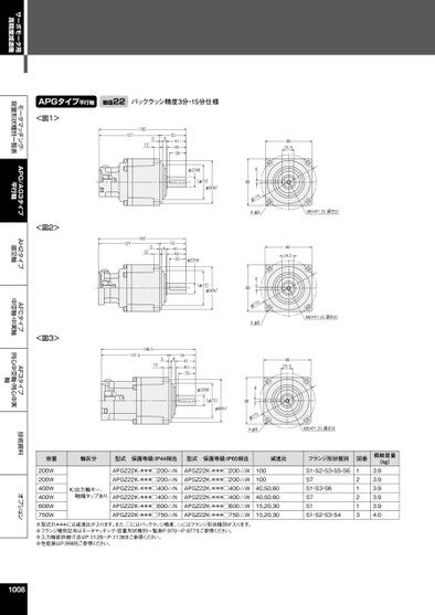 サーボモータ用高精度減速機モータマッチング・容量形状種別一覧表APG/AG3タイプ平行軸AH2タイプ直交軸AFCタイプ中空軸・中実軸AF3タイプ同心中空軸・同心中実軸技術資料オプションAPGタイプ平行軸軸径22バックラッシ精度3分・15分仕様<図1><図2><図3>127182125955414035φ22h6(φ72)φ90h7127182512955414035φ22h6(φ72)φ90h7196.5141.5591255414035φ22h6(φ72)φ90h79824.59824.59824.5M8×P1.25深さ20M8×P1.25深さ20M8×P1.25深さ20698511φ4-φ9698511φ4-φ9698511φ4-φ9容量軸区分型式保護等級:IP44相当型式保護等級:IP65相当減速比フランジ形状種別図番概略質量(kg)200W200W400W400W600W750WK:出力軸キー、軸端タップありAPGZ22K-***□200△NAPGZ22K-***□200△NAPGZ22K-***□400△NAPGZ22K-***□400△NAPGZ22K-***□600△NAPGZ22K-***□750△NAPGZ22K-***□200△WAPGZ22K-***□200△WAPGZ22K-***□400△WAPGZ22K-***□400△WAPGZ22K-***□600△WAPGZ22K-***□750△W10010040,50,6040,50,6015,20,3015,20,30S1・S2・S3・S5・S6S7S1・S3・S6S7S1S1・S2・S3・S41212133.93.93.93.93.94.0※型式の***には減速比が入ります。また、□にはバックラッシ精度、△にはフランジ形状種別が入ります。※フランジ種別記号はモータマッチング・容量形状種別一覧表P.970~P.977をご参照ください。※入力軸部詳細寸法はP.1128~P.1136をご参照ください。※性能表はP.998をご参照ください。1008