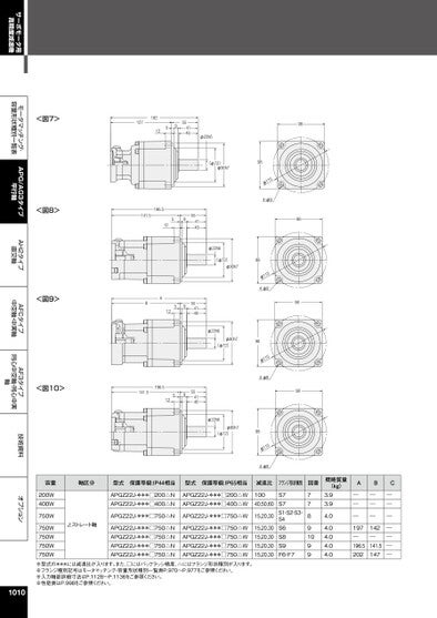 サーボモータ用高精度減速機モータマッチング・容量形状種別一覧表APG/AG3タイプ平行軸AH2タイプ直交軸AFCタイプ中空軸・中実軸AF3タイプ同心中空軸・同心中実軸技術資料オプション<図7><図8><図9>1271821295554140φ22h6(φ72)φ90h798511φ4-φ998511φ4-φ9196.5141.55912554140AB5912554140φ22h6(φ72)φ90h7<図10>196.5141.55912554140φ22h6φ90h7(φ72)98511φ4-φ9φ22h6φ90h7(φ72)98511φ4-φ998989898容量軸区分型式保護等級:IP44相当型式保護等級:IP65相当減速比フランジ形状種別図番概略質量(kg)ABC200W400W750W750W750W750W750WJ:ストレート軸APGZ22J-***□200△NAPGZ22J-***□400△NAPGZ22J-***□200△WAPGZ22J-***□400△W10040,50,60APGZ22J-***□750△NAPGZ22J-***□750△W15,20,30APGZ22J-***□750△NAPGZ22J-***□750△NAPGZ22J-***□750△NAPGZ22J-***□750△NAPGZ22J-***□750△WAPGZ22J-***□750△WAPGZ22J-***□750△WAPGZ22J-***□750△W15,20,3015,20,3015,20,3015,20,30S7S7S1・S2・S3・S4S6S8S9F6・F7778910993.93.94.04.04.04.04.0――――――197―196.5202142―141.5147―――――――※型式の***には減速比が入ります。また、□にはバックラッシ精度、△にはフランジ形状種別が入ります。※フランジ種別記号はモータマッチング・容量形状種別一覧表P.970~P.977をご参照ください。※入力軸部詳細寸法はP.1128~P.1136をご参照ください。※性能表はP.998をご参照ください。1010