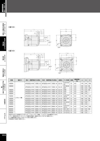 サーボモータ用高精度減速機モータマッチング・容量形状種別一覧表APG/AG3タイプ平行軸AH2タイプ直交軸AFCタイプ中空軸・中実軸AF3タイプ同心中空軸・同心中実軸技術資料オプション<図13><図14>□C98□130985469BA1259554140AB5912554140φ22h6(φ72)φ90h798511φ4-φ9φ22h6(φ72)φ90h798511φ4-φ9容量軸区分型式保護等級:IP44相当型式保護等級:IP65相当減速比フランジ形状種別図番概略質量(kg)ABC1000W1000W1000W1000W1000W1500W1500W1500W1500W1500W2000W2000W2000W2000WJ:ストレート軸APGZ22J-***□1000△NAPGZ22J-***□1000△W3,5,10APGZ22J-***□1000△NAPGZ22J-***□1000△W3,5,10APGZ22J-***□1000△NAPGZ22J-***□1000△NAPGZ22J-***□1000△NAPGZ22J-***□1000△WAPGZ22J-***□1000△WAPGZ22J-***□1000△W3,5,103,5,103,5,10APGZ22J-***□1500△NAPGZ22J-***□1500△W3,5,10APGZ22J-***□1500△NAPGZ22J-***□1500△NAPGZ22J-***□1500△NAPGZ22J-***□1500△NAPGZ22J-***□1500△WAPGZ22J-***□1500△WAPGZ22J-***□1500△WAPGZ22J-***□1500△W3,5,103,5,103,5,103,5,10APGZ22J-***□2000△NAPGZ22J-***□2000△W3,5,10APGZ22J-***□2000△NAPGZ22J-***□2000△NAPGZ22J-***□2000△NAPGZ22J-***□2000△WAPGZ22J-***□2000△WAPGZ22J-***□2000△W3,5,103,5,103,5,10K13・K21・K22・K23K67・K6E・K61K81K99K33F31K13・K21・K22・K23・KAAK61・K67K99K31・K32・K33F31K13・K21・K22・K23・KAAK61・K67K31・K32・K33F31・F32・F331313131314141313131414131314144.04.04.04.04.04.54.04.04.04.54.54.04.04.54.51791801801791841881791801791841881791801841881241251251241291331241251241291331241251291331009510095――1009595――10095――※型式の***には減速比が入ります。また、□にはバックラッシ精度、△にはフランジ形状種別が入ります。※フランジ種別記号はモータマッチング・容量形状種別一覧表P.970~P.977をご参照ください。※入力軸部詳細寸法はP.1128~P.1136をご参照ください。※性能表はP.998をご参照ください。1012