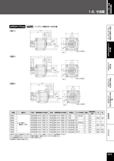 1-2.寸法図サーボモータ用高精度減速機オプション技術資料AF3タイプ同心中空軸・同心中実軸AFCタイプ中空軸・中実軸AH2タイプ直交軸APG/AG3タイプ平行軸モータマッチング・容量形状種別一覧表APGタイプ平行軸軸径28バックラッシ精度3分・15分仕様<図1><図2><図3>203.51405111563.547.54540AB1151563.547.5454034.53126.5φ28h68(φ88)120φ110h7041φ4-φ11φ28h6(φ88)φ110h78120041φ4-φ11223.51605111563.547.54540φ28h68(φ88)120φ110h7041φ4-φ11120311203112031M8×P1.25深さ20M8×P1.25深さ20M8×P1.25深さ20容量軸区分型式保護等級:IP44相当型式保護等級:IP65相当減速比フランジ形状種別図番概略質量(kg)AB400W400W600W750W750W750W750W750WK:出力軸キー、軸端タップありAPGZ28K-***□400△NAPGZ28K-***□400△NAPGZ28K-***□600△NAPGZ28K-***□750△NAPGZ28K-***□750△NAPGZ28K-***□750△NAPGZ28K-***□750△NAPGZ28K-***□750△NAPGZ28K-***□400△WAPGZ28K-***□400△WAPGZ28K-***□600△WAPGZ28K-***□750△WAPGZ28K-***□750△WAPGZ28K-***□750△WAPGZ28K-***□750△WAPGZ28K-***□750△W10010040,50,6040,50,6040,50,6040,50,6040,50,6040,50,60S1・S3・S6S7S1S1・S2・S3・S4S6S8S9F6・F7121323228.08.08.08.08.08.08.08.0―203.5――224―223.5229―140――160.5―160165.5※型式の***には減速比が入ります。また、□にはバックラッシ精度、△にはフランジ形状種別が入ります。※フランジ種別記号はモータマッチング・容量形状種別一覧表P.970~P.977をご参照ください。※入力軸部詳細寸法はP.1128~P.1136をご参照ください。※性能表はP.998をご参照ください。1013