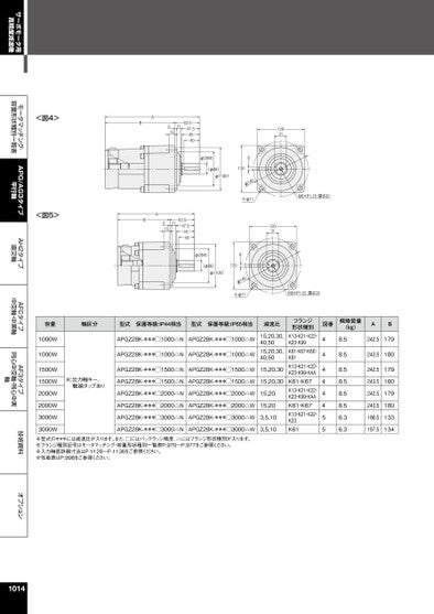 サーボモータ用高精度減速機モータマッチング・容量形状種別一覧表APG/AG3タイプ平行軸AH2タイプ直交軸AFCタイプ中空軸・中実軸AF3タイプ同心中空軸・同心中実軸技術資料オプション<図4><図5>AB5111563.547.54540AB1151563.547.54540φ28h68(φ88)120φ110h7041φ4-φ11φ28h68(φ88)120φ110h7041φ4-φ111203112031M8×P1.25深さ20M8×P1.25深さ20フランジ形状種別K13・K21・K22・K23・K99K61・K67・K6E・K81K13・K21・K22・K23・K99・KAAK61・K67K13・K21・K22・K23・K99・KAAK61・K67K13・K21・K22・K23K61図番概略質量(kg)444444558.58.58.58.58.58.56.36.3AB242.5179243.5180242.5179243.5180242.5179243.5180196.5133197.5134容量軸区分型式保護等級:IP44相当型式保護等級:IP65相当減速比1000W1000W1500W1500W2000W2000W3000W3000WK:出力軸キー、軸端タップありAPGZ28K-***□1000△NAPGZ28K-***□1000△WAPGZ28K-***□1000△NAPGZ28K-***□1000△W15,20,30,40,5015,20,30,40,50APGZ28K-***□1500△NAPGZ28K-***□1500△W15,20,30APGZ28K-***□1500△NAPGZ28K-***□1500△W15,20,30APGZ28K-***□2000△NAPGZ28K-***□2000△W15,20APGZ28K-***□2000△NAPGZ28K-***□2000△W15,20APGZ28K-***□3000△NAPGZ28K-***□3000△W3,5,10APGZ28K-***□3000△NAPGZ28K-***□3000△W3,5,10※型式の***には減速比が入ります。また、□にはバックラッシ精度、△にはフランジ形状種別が入ります。※フランジ種別記号はモータマッチング・容量形状種別一覧表P.970~P.977をご参照ください。※入力軸部詳細寸法はP.1128~P.1136をご参照ください。※性能表はP.998をご参照ください。1014