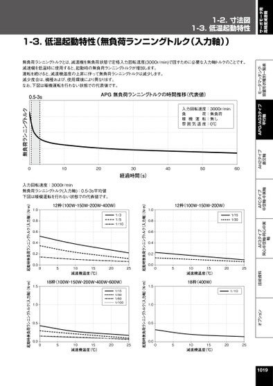 サーボモータ用高精度減速機オプション技術資料AF3タイプ同心中空軸・同心中実軸AFCタイプ中空軸・中実軸AH2タイプ直交軸APG/AG3タイプ平行軸モータマッチング・容量形状種別一覧表1-2.寸法図1-3.低温起動特性1-3.低温起動特性(無負荷ランニングトルク(入力軸))無負荷ランニングトルクとは、減速機を無負荷状態で定格入力回転速度(3000r/min)で回すために必要な入力軸トルクのことです。減速機を低温時に使用すると、起動時の無負荷ランニングトルクが増加します。運転を続けると、減速機温度の上昇に伴って無負荷ランニングトルクは減少します。減少度合は、機種および、使用環境により異なります。なお、下図は暖機運転を行わない状態での代表値です。0.5-3sAPG無負荷ランニングトルクの時間推移(代表値)入力回転速度負荷暖転雰囲気温度機:3000r/min:無負荷:無し:0℃運無負荷ランニングトルク12枠(100W・150W・200W)1/151/30051015減速機温度(℃)18枠(400W)20251/101.00.80.60.40.20.01.51.00.50.0051015減速機温度(℃)20251019起動時無負荷ランニングトルク(入力軸)N・m)起動時無負荷ランニングトルク(入力軸)(N・m)12枠(100W・150W・200W・400W)1/31/51/101.00.80.60.40.20.0051015減速機温度(℃)20251.51.00.50.0018枠(100W・150W・200W・400W・600W)1/151/301/601/10051015減速機温度(℃)2025起動時無負荷ランニングトルク(入力軸)N・m)起動時無負荷ランニングトルク(入力軸)(N・m)0102030405060経過時間(s)入力回転速度:3000r/min無負荷ランニングトルク(入力軸):0.5-3s平均値下図は暖機運転を行わない状態での代表値です。