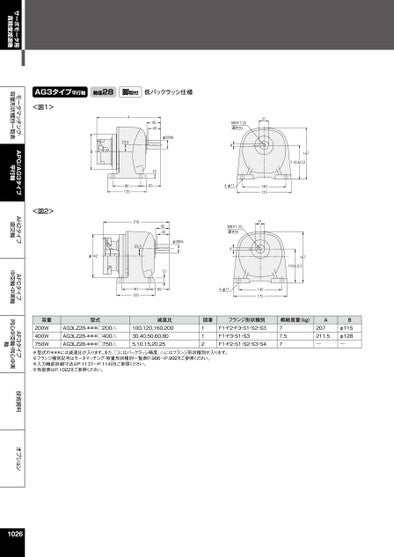サーボモータ用高精度減速機モータマッチング・容量形状種別一覧表APG/AG3タイプ平行軸AH2タイプ直交軸AFCタイプ中空軸・中実軸AF3タイプ同心中空軸・同心中実軸技術資料オプションAG3タイプ平行軸軸径28脚取付低バックラッシ仕様<図1><図2>Bφ142A23.5901254540φ28h6156521623.590125φ28h6454015653114017531M8×1.25深さ2084-φ11M8×1.25深さ2084-φ11140175167110±0.2167110±0.2容量200W400W750W型式AG3LZ28-***□200△AG3LZ28-***□400△AG3LZ28-***□750△減速比100,120,160,20030,40,50,60,805,10,15,20,25図番112フランジ形状種別F1・F2・F3・S1・S2・S3F1・F3・S1・S3F1・F2・S1・S2・S3・S4概略質量(kg)77.57A207211.5―Bφ115φ128―※型式の***には減速比が入ります。また、□にはバックラッシ精度、△にはフランジ形状種別が入ります。※フランジ種別記号はモータマッチング・容量形状種別一覧表P.986~P.992をご参照ください。※入力軸部詳細寸法はP.1137~P.1140をご参照ください。※性能表はP.1022をご参照ください。1026