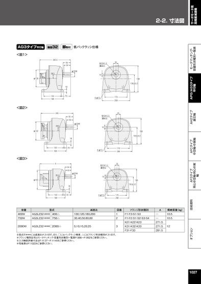 2-2.寸法図サーボモータ用高精度減速機オプション技術資料AF3タイプ同心中空軸・同心中実軸AFCタイプ中空軸・中実軸AH2タイプ直交軸APG/AG3タイプ平行軸モータマッチング・容量形状種別一覧表AG3タイプ平行軸軸径32脚取付低バックラッシ仕様<図1><図2><図3>φ128φ142φ165230.528.5130168φ32h65550187024528.5130168A28.51301685550φ32h618705550φ32h61870容量400W750W型式AG3LZ32-***□400△AG3LZ32-***□750△減速比100,120,160,20030,40,50,60,802000WAG3LZ32-***□2000△5,10,15,20,25※型式の***には減速比が入ります。また、□にはバックラッシ精度、△にはフランジ形状種別が入ります。※フランジ種別記号はモータマッチング・容量形状種別一覧表P.986~P.992をご参照ください。※入力軸部詳細寸法はP.1137~P.1140をご参照ください。※性能表はP.1022をご参照ください。M10×1.5深さ2535104-φ13M10×1.5深さ25104-φ13M10×1.5深さ25104-φ131702083517020835170208図番123198130±0.2198130±0.2198130±0.2フランジ形状種別F1・F3・S1・S3F1・F2・S1・S2・S3・S4K21・K22・K23K31・K32・K33F31・F33A――271.5271.5281.5概略質量(kg)10.510.5121027