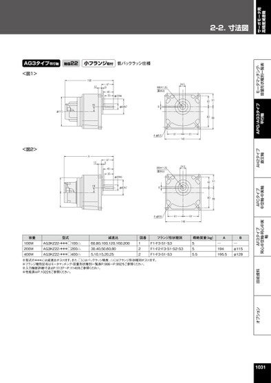 2-2.寸法図サーボモータ用高精度減速機オプション技術資料AF3タイプ同心中空軸・同心中実軸AFCタイプ中空軸・中実軸AH2タイプ直交軸APG/AG3タイプ平行軸モータマッチング・容量形状種別一覧表AG3タイプ平行軸軸径22小フランジ取付低バックラッシ仕様<図1><図2>φ115B19012194754035φ22h624.5M8×1.25深さ20φ60h764754035A1219φ22h6φ60h74-φ8.66161140M8×1.25深さ2024.564-φ8.661611405142808951428089容量100W200W400W型式減速比AG3KZ22-***□100△AG3KZ22-***□200△AG3KZ22-***□400△60,80,100,120,160,20030,40,50,60,805,10,15,20,25図番122フランジ形状種別F1・F3・S1・S3F1・F2・F3・S1・S2・S3F1・F3・S1・S3概略質量(kg)555.5A―194195.5B―φ115φ128※型式の***には減速比が入ります。また、□にはバックラッシ精度、△にはフランジ形状種別が入ります。※フランジ種別記号はモータマッチング・容量形状種別一覧表P.986~P.992をご参照ください。※入力軸部詳細寸法はP.1137~P.1140をご参照ください。※性能表はP.1022をご参照ください。1031