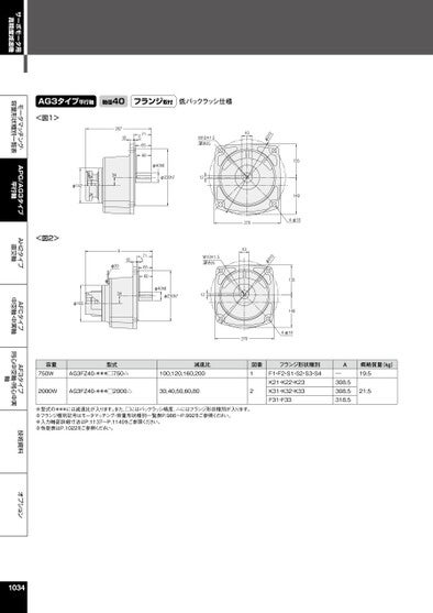サーボモータ用高精度減速機モータマッチング・容量形状種別一覧表APG/AG3タイプ平行軸AH2タイプ直交軸AFCタイプ中空軸・中実軸AF3タイプ同心中空軸・同心中実軸技術資料オプションAG3タイプ平行軸軸径40フランジ取付低バックラッシ仕様<図1><図2>φ142φ165267187156560M10×1.5深さ2543φ310φ40h634φ230h71227043M10×1.5深さ25φ310Aφ2018715656034φ40h6φ230h7122701351494-φ181351494-φ18容量750W型式減速比AG3FZ40-***□750△100,120,160,2002000WAG3FZ40-***□2000△30,40,50,60,80図番12フランジ形状種別F1・F2・S1・S2・S3・S4K21・K22・K23K31・K32・K33F31・F33A―308.5308.5318.5概略質量(kg)19.521.5※型式の***には減速比が入ります。また、□にはバックラッシ精度、△にはフランジ形状種別が入ります。※フランジ種別記号はモータマッチング・容量形状種別一覧表P.986~P.992をご参照ください。※入力軸部詳細寸法はP.1137~P.1140をご参照ください。※性能表はP.1022をご参照ください。1034