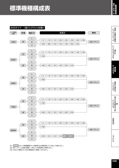 サーボモータ用高精度減速機オプション技術資料AF3タイプ同心中空軸・同心中実軸AFCタイプ中空軸・中実軸AH2タイプ直交軸APG/AG3タイプ平行軸モータマッチング・容量形状種別一覧表標準機種構成表AH2タイプ<低バックラッシ仕様>モータ相当容量枠番軸区分減速比精度100W22200W400W750W2000W2228283232404050LRTLRTLRTLRTLRTLRTLRTLRTLRT1/51/101/151/201/251/301/401/501/601/801/1001/1201/1601/2001/240L低バックラッシ)1/51/101/151/201/251/301/401/501/601/801/1001/1201/1601/2001/2401/51/101/151/201/251/301/401/501/601/801/1001/1201/1601/2001/2401/51/101/151/201/251/301/401/501/601/801/1001/1201/1601/2001/2401/51/101/151/201/251/301/401/501/601/801/1001/1201/1601/2001/240L低バックラッシ)L低バックラッシ)L低バックラッシ)L低バックラッシ)注1.はトルク制限機種です。性能表の出力軸許容トルクに特にご注意ください。注2.低バックラッシ仕様の精度につきましては性能表をご参照ください。注3.AH2には精度1分・3分仕様製品はご用意しておりません。1039