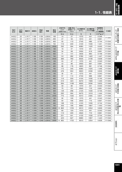 1-1.性能表サーボモータ用高精度減速機オプション技術資料AF3タイプ同心中空軸・同心中実軸AFCタイプ中空軸・中実軸AH2タイプ直交軸APG/AG3タイプ平行軸モータマッチング・容量形状種別一覧表取付区分出力軸径軸区分減速比AH2LZAH2LZAH2LZAH2LZAH2LZAH2LZAH2LZAH2LZAH2LZAH2LZAH2LZAH2LZAH2LZAH2LZAH2LZAH2LZAH2LZAH2LZAH2LZAH2LZAH2LZAH2LZAH2LZAH2LZAH2LZAH2LZAH2LZAH2LZAH2LZAH2LZAH2LZAH2LZAH2LZAH2LZAH2LZ2222283240222832405022283240502228324050222832405022283240502228324050L/R/TL/R/TL/R/TL/R/TL/R/TL/R/TL/R/TL/R/TL/R/TL/R/TL/R/TL/R/TL/R/TL/R/TL/R/TL/R/TL/R/TL/R/TL/R/TL/R/TL/R/TL/R/TL/R/TL/R/TL/R/TL/R/TL/R/TL/R/TL/R/TL/R/TL/R/TL/R/TL/R/TL/R/TL/R/T1/601/601/601/601/601/801/801/801/801/801/1001/1001/1001/1001/1001/1201/1201/1201/1201/1201/1601/1601/1601/1601/1601/2001/2001/2001/2001/2001/2401/2401/2401/2401/240実減速比1/591/591/591/591/601/801/801/801/801/801/1001/1001/1001/1001/1001/1201/1201/1201/1201/1201/1601/1601/1601/1603/4701/2001/2001/2001/2001/1961/2361/2361/2361/2401/240精度相当容量L(30分)L(30分)L(30分)L(30分)L(30分)L(30分)L(30分)L(30分)L(30分)L(30分)L(30分)L(30分)L(30分)L(30分)L(30分)L(30分)L(30分)L(30分)L(30分)L(30分)L(30分)L(30分)L(30分)L(30分)L(30分)L(30分)L(30分)L(30分)L(30分)L(30分)L(30分)L(30分)L(30分)L(30分)L(30分)1002004007502000100200400750200010020040075020001002004007502000100200400750200010020040075020001002004007502000許容平均トルク(3000r/min)N・m14275511029219347114138024438817247630571102125844075149282775509418835386260110221423862※※起動・停止許容ピークトルクN・m27551102205843769141282760478617634595361114220423116880151298564155010018837670617251202204418471725出力軸許容O.H.L.出力軸許容スラスト荷重N15701810274041206080157024503430578085301570265038206080882015702740412062709020157028404120647093101570284041206660951015702840412066609510N441451686103015204416188631422210844166796115202206441686103015692256441716103016182305441716103016672354441716103016672354内部慣性モーメント(入力軸換算)×10-4kg・m20.3460.6910.7441.4416.5000.3430.6910.7461.4475.8390.3430.6910.7461.4465.8350.3430.6910.7451.4455.8330.3430.6910.7451.4445.8310.3430.6910.7441.4435.8290.3430.6910.7441.4435.828寸法図P.1042P.1043P.1044P.1045P.1042P.1043P.1044P.1045P.1046P.1042P.1043P.1044P.1045P.1046P.1042P.1043P.1044P.1045P.1046P.1042P.1043P.1044P.1045P.1046P.1042P.1043P.1044P.1045P.1046P.1042P.1043P.1044P.1045P.10461041