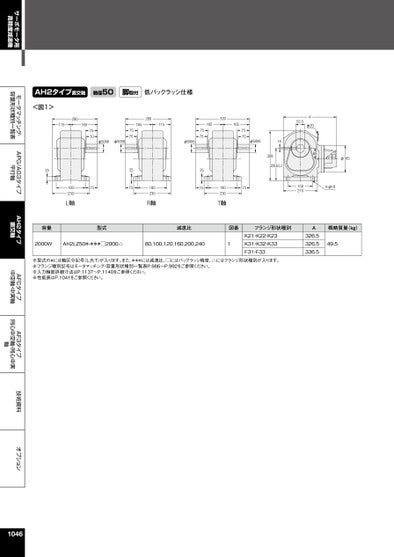 サーボモータ用高精度減速機モータマッチング・容量形状種別一覧表APG/AG3タイプ平行軸AH2タイプ直交軸AFCタイプ中空軸・中実軸AF3タイプ同心中空軸・同心中実軸技術資料オプションAH2タイプ直交軸軸径50脚取付低バックラッシ仕様<図1>28011516528016511533016516553.5Aφ20φ50h6φ50h675707575702575180230R軸φ50h675702575180230T軸φ50h614308200±0.275707525180230L軸65φ1651502104-φ18容量型式減速比図番フランジ形状種別A概略質量(kg)2000WAH2LZ50#-***□2000△80,100,120,160,200,2401K21・K22・K23K31・K32・K33F31・F33326.5326.5336.549.5※型式の#には軸区分記号(L,R,T)が入ります。また、***には減速比、□にはバックラッシ精度、△にはフランジ形状種別が入ります。※フランジ種別記号はモータマッチング・容量形状種別一覧表P.986~P.992をご参照ください。※入力軸部詳細寸法はP.1137~P.1140をご参照ください。※性能表はP.1041をご参照ください。1046