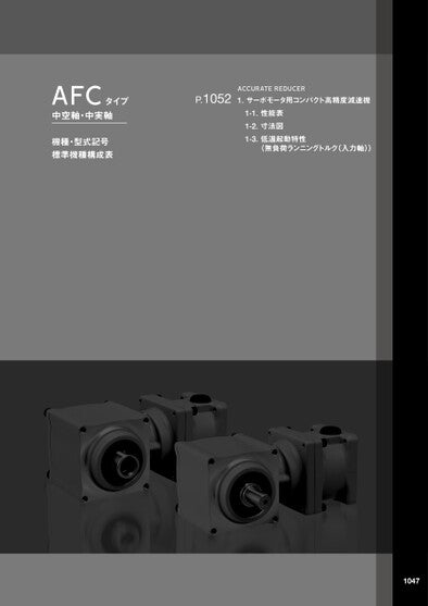 AFCタイプ中空軸・中実軸機種・型式記号標準機種構成表P.1052ACCURATEREDUCER1.サーボモータ用コンパクト高精度減速機1-1.性能表1-2.寸法図1-3.低温起動特性(無負荷ランニングトルク(入力軸))1047