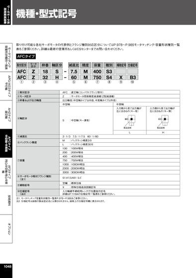 サーボモータ用高精度減速機モータマッチング・容量形状種別一覧表APG/AG3タイプ平行軸AH2タイプ直交軸AFCタイプ中空軸・中実軸AF3タイプ同心中空軸・同心中実軸技術資料オプション機種・型式記号取り付け可能な各社サーボモータの代表例とフランジ種別対応区分についてはP.978~P.985モータマッチング・容量形状種別一覧表をご参照ください。詳細は最寄の営業所もしくはCSセンターまでお問い合わせください。:サーボモータ用高精度減速機(Z型減速機)AFC:直交軸(コンパクトフランジ取付)Z出力軸径(中空軸タイプは内径、中実軸タイプは外径)中空軸中実軸入力側から見て出力軸が左に出るもの(キー有)入力側から見て出力軸が左に出るもの(キー無)補助記号仕様記号X⑨B3⑩容量400750⑦種別S3S4⑧MM⑥7.560⑤SH④軸区分減速比精度枠番1832③AFCタイプモータ区分ZZ②取付区分AFCAFC①①取付区分②モータ区分③枠番および出力軸径製品銘板L製品銘板H④軸区分S:中空軸(キー溝有)⑤減速比⑥バックラッシ精度⑦容量:バックラッシ精度3分:バックラッシ精度30分3:1/37.5:1/7.560:1/60ML100:100W相当200:200W相当400:400W相当750:750W相当1000:1000W相当2000:2000W相当3000:3000W相当⑧サーボモータ取付フランジ種別(注1)S1,K13,K61など⑨補助記号⑩仕様記号(注2):特殊仕様追加認識記号空欄:標準仕様X入力軸継手締結用レンチ穴位置指示記号詳細はP.1184の仕様記号一覧表をご参照ください。注1.モータマッチング容量形状種別一覧表P.978~P.985をご参照ください。注2.仕様記号は銘板の製品型式名には表示されません。銘板上の仕様記号欄に表示されます。1048