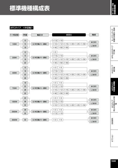 標準機種構成表サーボモータ用高精度減速機オプション技術資料AF3タイプ同心中空軸・同心中実軸AFCタイプ中空軸・中実軸AH2タイプ直交軸APG/AG3タイプ平行軸モータマッチング・容量形状種別一覧表標準機種構成表AFCタイプ<中空軸>モータ相当容量枠番軸区分減速比100W200W400W750W1000W2000W3000W1215181215182215182228182228322228322832321/7.51/10S(中空軸・キー溝有)1/101/121/151/201/251/30S(中空軸・キー溝有)S(中空軸・キー溝有)S(中空軸・キー溝有)1/401/501/601/51/7.51/101/101/121/151/201/251/301/401/501/601/31/51/7.51/101/101/121/151/201/251/301/401/501/601/31/51/7.51/101/101/121/151/201/251/301/401/501/601/31/5S(中空軸・キー溝有)1/7.51/101/101/121/151/201/251/30S(中空軸・キー溝有)1/31/51/7.51/10S(中空軸・キー溝有)1/31/5精度M(3分)L30分)M(3分)L30分)M(3分)L30分)M(3分)L30分)M(3分)L30分)M(3分)L30分)M(3分)L30分)1049