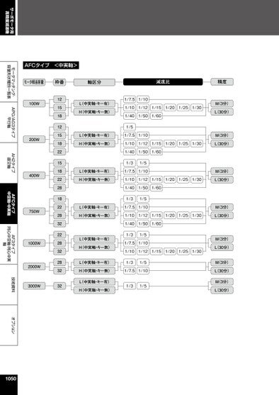 サーボモータ用高精度減速機モータマッチング・容量形状種別一覧表APG/AG3タイプ平行軸AH2タイプ直交軸AFCタイプ中空軸・中実軸AF3タイプ同心中空軸・同心中実軸技術資料オプションAFCタイプ<中実軸>モータ相当容量枠番軸区分減速比精度100W200W400W750W1000W2000W3000W121518121518221518222818222832222832283232L中実軸・キー有)H(中実軸・キー無)1/7.51/101/101/121/151/201/251/301/401/501/601/5L中実軸・キー有)1/7.51/10H(中実軸・キー無)1/101/121/151/201/251/301/401/501/601/31/5L中実軸・キー有)1/7.51/10H(中実軸・キー無)1/101/121/151/201/251/301/401/501/601/31/5L中実軸・キー有)1/7.51/10H(中実軸・キー無)1/101/121/151/201/251/30L中実軸・キー有)H(中実軸・キー無)1/401/501/601/31/51/7.51/101/101/121/151/201/251/30L中実軸・キー有)1/31/5H(中実軸・キー無)1/7.51/10L中実軸・キー有)H(中実軸・キー無)1/31/5M(3分)L30分)M(3分)L30分)M(3分)L30分)M(3分)L30分)M(3分)L30分)M(3分)L30分)M(3分)L30分)1050