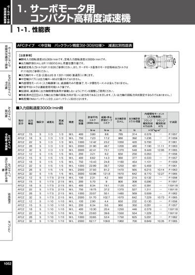 サーボモータ用高精度減速機モータマッチング・容量形状種別一覧表APG/AG3タイプ平行軸AH2タイプ直交軸AFCタイプ中空軸・中実軸AF3タイプ同心中空軸・同心中実軸技術資料オプション1.サーボモータ用コンパクト高精度減速機1-1.性能表AFCタイプ<中空軸バックラッシ精度3分・30分仕様>減速比別性能表【注意事項】●瞬時入力回転速度は5,000r/minです。定格入力回転速度は3000r/minです。●出力軸許容O.H.L.はP.1180のO.H.L.荷重位置の値です。●連続定格入力トルクはP.1183をご参照ください。また、サーボモータ基準のモータ定格時出力トルクはP.1162をご参照ください。●出力軸のキー寸法・公差はJISB1301-1996(普通形)に準じます。●中空軸タイプには出力軸キー材は付属されておりません。●内部慣性モーメント(入力軸換算)は、減速機のみの数値で、モータ慣性モーメントは含んでおりません。●許容平均トルクは連続使用可能トルク値です。●加速時、減速時に出力軸側慣性負荷が振動しないようにゲインを調整しご使用ください。●性能表内●精度欄のMはバックラッシ3分、Lはバックラッシ30分となります。は入力軸と出力軸の回転方向が互いに逆方向であることを示します。入・出力軸の回転方向を限定するものではありません。)許容平均トルク(3000r/min)起動・停止許容ピークトルク出力軸許容O.H.L.出力軸許容スラスト荷重N・m3.807.2312.4231.9042.413.216.6210.4322.9937.9353.962.315.708.3419.7533.0751.702.906.3410.3023.8333.6562.17N・m8.617.223.248.773.16.214.324.838.781.2121.84.2919.137.250.1102.74.49.620.439.653.4109.6N785980105012001370650980118012501470167056080011201370148016706509801250155017501960N314392420480548250377454481565642215308431527569642232350446554625700内部慣性モーメント(入力軸換算)フランジ種別形状K75以外フランジ種別形状K75×10-4kg・m20.3781.2365.7007.1909.4490.2630.3331.1015.4596.2158.7700.1320.2900.3911.3115.5097.2290.1300.2810.3791.2295.2916.849―――11.1112.95――――10.1412.27―――――10.73―――――10.35寸法図P.1057P.1059P.1061P.1063P.1065P.1056P.1057P.1059P.1061P.1063P.1065P.1056P.1057P.1058/P.059P.1060/P.061P.1062P.1065P.1056P.1057P.1058/P.059P.1060/P.061P.1062P.1065■入力回転速度3000r/min時取付区分出力軸径軸区分減速比実減速比精度相当容量AFCZAFCZAFCZAFCZAFCZAFCZAFCZAFCZAFCZAFCZAFCZAFCZAFCZAFCZAFCZAFCZAFCZAFCZAFCZAFCZAFCZAFCZAFCZ1518222832121518222832121518222832121518222832SSSSSSSSSSSSSSSSSSSSSSS1/31/31/31/31/31/51/51/51/51/51/51/7.51/7.51/7.51/7.51/7.51/7.51/101/101/101/101/101/101/31/31/31/31/31/51/51/51/51/51/52/152/152/152/152/152/151/101/101/101/101/101/10M/LM/LM/LM/LM/LM/LM/LM/LM/LM/LM/LM/LM/LM/LM/LM/LM/LM/LM/LM/LM/LM/LM/L40075010002000300020040075010002000300010020040075010002000100200400750100020001052