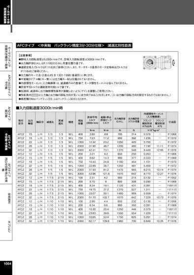 サーボモータ用高精度減速機モータマッチング・容量形状種別一覧表APG/AG3タイプ平行軸AH2タイプ直交軸AFCタイプ中空軸・中実軸AF3タイプ同心中空軸・同心中実軸技術資料オプションAFCタイプ<中実軸バックラッシ精度3分・30分仕様>減速比別性能表【注意事項】●瞬時入力回転速度は5,000r/minです。定格入力回転速度は3000r/minです。●出力軸許容O.H.L.はP.1180のO.H.L.荷重位置の値です。●連続定格入力トルクはP.1183をご参照ください。また、サーボモータ基準のモータ定格時出力トルクはP.1164をご参照ください。●出力軸のキー寸法・公差はJISB1301-1996(普通形)に準じます。●中実軸タイプH軸(キー無)には出力軸キー材は付属されておりません。●内部慣性モーメント(入力軸換算)は、減速機のみの数値で、モータ慣性モーメントは含んでおりません。●許容平均トルクは連続使用可能トルク値です。●加速時、減速時に出力軸側慣性負荷が振動しないようにゲインを調整しご使用ください。●性能表内●精度欄のMはバックラッシ3分、Lはバックラッシ30分となります。は入力軸と出力軸の回転方向が互いに逆方向であることを示します。入・出力軸の回転方向を限定するものではありません。)許容平均トルク(3000r/min)起動・停止許容ピークトルク出力軸許容O.H.L.出力軸許容スラスト荷重N・m3.807.2312.4231.9042.413.216.6210.4322.9937.9353.962.315.708.3419.7533.0751.702.906.3410.3023.8333.6562.17N・m8.617.223.248.773.16.214.324.838.781.2121.84.2919.137.250.1102.74.49.620.439.653.4109.6N785980105012001370650980118012501470167056080011201370148016706509801250155017501960N314392420480548250377454481565642215308431527569642232350446554625700内部慣性モーメント(入力軸換算)フランジ種別形状K75以外フランジ種別形状K75×10-4kg・m20.3781.2365.7007.1909.4490.2630.3331.1015.4596.2158.7700.1320.2900.3911.3115.5097.2290.1300.2810.3791.2295.2916.849―――11.1112.95――――10.1412.27―――――10.73―――――10.35寸法図P.1068P.1070P.1072P.1074P.1076P.1066P.1068P.1070P.1072P.1074P.1076P.1052P.1068P.1069/P.070P.1071/P.072P.1074P.1076P.1056P.1068P.1069/P.070P.1071/P.072P.1074P.1076■入力回転速度3000r/min時取付区分出力軸径軸区分減速比実減速比精度相当容量AFCZAFCZAFCZAFCZAFCZAFCZAFCZAFCZAFCZAFCZAFCZAFCZAFCZAFCZAFCZAFCZAFCZAFCZAFCZAFCZAFCZAFCZAFCZ1518222832121518222832121518222832121518222832L/HL/HL/HL/HL/HL/HL/HL/HL/HL/HL/HL/HL/HL/HL/HL/HL/HL/HL/HL/HL/HL/HL/H1/31/31/31/31/31/51/51/51/51/51/51/7.51/7.51/7.51/7.51/7.51/7.51/101/101/101/101/101/101/31/31/31/31/31/51/51/51/51/51/52/152/152/152/152/152/151/101/101/101/101/101/10M/LM/LM/LM/LM/LM/LM/LM/LM/LM/LM/LM/LM/LM/LM/LM/LM/LM/LM/LM/LM/LM/LM/L40075010002000300020040075010002000300010020040075010002000100200400750100020001054