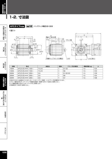 サーボモータ用高精度減速機モータマッチング・容量形状種別一覧表APG/AG3タイプ平行軸AH2タイプ直交軸AFCタイプ中空軸・中実軸AF3タイプ同心中空軸・同心中実軸技術資料オプション1-2.寸法図AFCタイプ中空軸軸径12バックラッシ精度3分・30分<図1>208914823φ12H8φ19φ46146.5φ12H8φ19(φ48.5)φ50h754保護キャップ取り付け時10.525.57958.533103フランジ面96A6531413.86267φ210保護キャップAFC-15(付属品)2-M3624-M5深さ15容量100W100W200W200W200W型式AFCZ12S-***□100△AFCZ12S-***□100△AFCZ12S-***□200△AFCZ12S-***□200△AFCZ12S-***□200△7.5,107.5,103,53,53,5減速比図番11111フランジ形状種別概略質量(kg)AS1・S3S6S1・S2・S3S6S71.51.51.51.51.5134133139135138※型式の***には減速比が入ります。また、□にはバックラッシ精度、△にはフランジ形状種別が入ります。※フランジ種別記号はモータマッチング・容量形状種別一覧表P.978~P.985をご参照ください。※入力軸部詳細寸法はP.1141~P.1147をご参照ください。※性能表はP.1052をご参照ください。1056