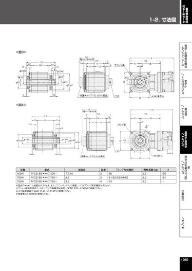 1-2.寸法図サーボモータ用高精度減速機オプション技術資料AF3タイプ同心中空軸・同心中実軸AFCタイプ中空軸・中実軸AH2タイプ直交軸APG/AG3タイプ平行軸モータマッチング・容量形状種別一覧表2311969<図3>12φ18H8φ29φ5327178φ18H8φ29(φ61)φ70h761保護キャップ取り付け時12104741831435フランジ面41A85126620.88289φ213保護キャップF3S-20(付属品)2-M5824-M6深さ18<図4>1196923122717861保護キャップ取り付け時1047412314318541フランジ面17985126689φφ53φ29φ18H8φ18H8φ29φ61φ70h7213保護キャップF3S-20(付属品)8220.82-M54-M6深さ182282容量400W750W750W型式AFCZ18S-***□400△AFCZ18S-***□750△AFCZ18S-***□750△7.5,103,53,5減速比図番334フランジ形状種別概略質量(kg)AS6S1・S2・S3・S4・S9SA3.23.23.2165181―※型式の***には減速比が入ります。また、□にはバックラッシ精度、△にはフランジ形状種別が入ります。※フランジ種別記号はモータマッチング・容量形状種別一覧表P.978~P.985をご参照ください。※入力軸部詳細寸法はP.1141~P.1147をご参照ください。※性能表はP.1052をご参照ください。1059