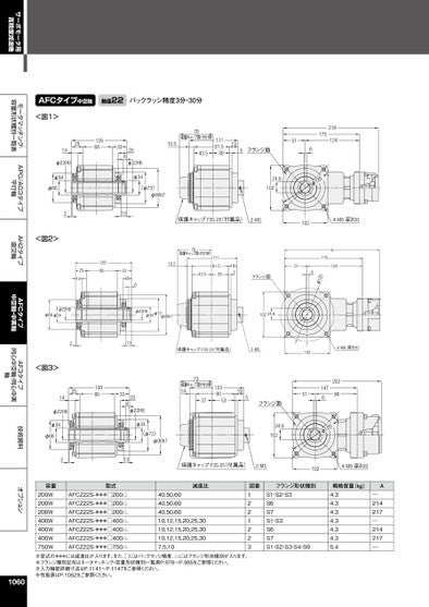 サーボモータ用高精度減速機モータマッチング・容量形状種別一覧表APG/AG3タイプ平行軸AH2タイプ直交軸AFCタイプ中空軸・中実軸AF3タイプ同心中空軸・同心中実軸技術資料オプションAFCタイプ中空軸軸径22バックラッシ精度3分・30分2512668<図1>14φ22H8φ34φ6633820φ22H8φ34(φ73)φ90h776保護キャップ取り付け時10.543.511181.53819フランジ面517521812451624.8102021φ213保護キャップF3S-25(付属品)2-M51024-M8深さ20<図2>1266825143320876保護キャップ取り付け時10.511181.543.538195フランジ面51175A1246021φφ22H8φ34φ66φ22H8φ34φ73φ90h710224.8213保護キャップF3S-25(付属品)2-M5<図3>2514φ22H8φ34φ661388033208φ22H8φ34(φ73)φ90h773保護キャップ取り付け時14123903753195フランジ面24.8102102514-M8深さ20202961476021φ213容量200W200W200W400W400W400W750W型式AFCZ22S-***□200△AFCZ22S-***□200△AFCZ22S-***□200△AFCZ22S-***□400△AFCZ22S-***□400△AFCZ22S-***□400△AFCZ22S-***□750△保護キャップF3S-25(付属品)2-M51024-M8深さ20減速比40,50,6040,50,6040,50,6010,12,15,20,25,3010,12,15,20,25,3010,12,15,20,25,307.5,10図番1221223フランジ形状種別概略質量(kg)AS1・S2・S3S6S7S1・S3S6S7S1・S2・S3・S4・S94.34.34.34.34.34.35.4―214217―214217―※型式の***には減速比が入ります。また、□にはバックラッシ精度、△にはフランジ形状種別が入ります。※フランジ種別記号はモータマッチング・容量形状種別一覧表P.978~P.985をご参照ください。※入力軸部詳細寸法はP.1141~P.1147をご参照ください。※性能表はP.1052をご参照ください。1060