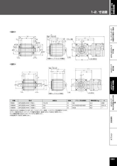 1-2.寸法図サーボモータ用高精度減速機オプション技術資料AF3タイプ同心中空軸・同心中実軸AFCタイプ中空軸・中実軸AH2タイプ直交軸APG/AG3タイプ平行軸モータマッチング・容量形状種別一覧表<図4>25141388033φ22H8φ34φ66208φ22H8φ34(φ73)φ90h773保護キャップ取り付け時1437123905319フランジ面55124.8102A961476021φ213保護キャップF3S-25(付属品)2-M51024-M8深さ20<図5>1388025143320873保護キャップ取り付け時14123903753195231.5147696φ22H8φ66φ34φ22H8φ34φ73φ90h7213保護キャップF3S-25(付属品)容量750W1000W1000W型式AFCZ22S-***□750△AFCZ22S-***□1000△AFCZ22S-***□1000△7.5,103,53,5減速比24.81022-M5図番4454-M8深さ20フランジ形状種別概略質量(kg)SAK13・K22・K23・K61KC95.46.26.2A200231.5―※型式の***には減速比が入ります。また、□にはバックラッシ精度、△にはフランジ形状種別が入ります。※フランジ種別記号はモータマッチング・容量形状種別一覧表P.978~P.985をご参照ください。※入力軸部詳細寸法はP.1141~P.1147をご参照ください。※性能表はP.1052をご参照ください。1061