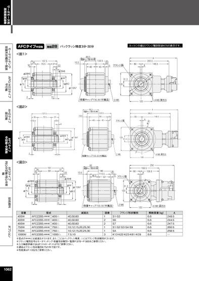 サーボモータ用高精度減速機モータマッチング・容量形状種別一覧表APG/AG3タイプ平行軸AH2タイプ直交軸AFCタイプ中空軸・中実軸AF3タイプ同心中空軸・同心中実軸技術資料オプションAFCタイプ中空軸軸径28バックラッシ精度3分・30分カッコ()の値はフランジ種別形状K75の表示です。<図1>3016137.570.5φ28H8φ44φ7537822φ28H8φ44(φ85)φ110h7213<図2>137.570.53016φ28H8φ75φ4437228φ28H8φ110h7φ44φ8580.5保護キャップ取り付け時9310.5122.5194845フランジ面5608A205.5145.531.3120041φ保護キャップF3S-30(付属品)2-M61204-M8深さ2080.5保護キャップ取り付け時10.548122.59345195フランジ面A205.560145.58041φ12031.3213保護キャップF3S-30(付属品)2-M64-M8深さ20120<図3>301616194φ28H8φ44φ7537822φ28H8φ44φ110h7(φ96.5)82保護キャップ取り付け時13.546.5146113.567195フランジ面250165.560105.58041φ31.3120213保護キャップF3S-30(付属品)2-M61204-M8深さ20容量400W400W400W750W750W1000W型式AFCZ28S-***□400△AFCZ28S-***□400△AFCZ28S-***□400△AFCZ28S-***□750△AFCZ28S-***□750△AFCZ28S-***□1000△減速比40,50,6040,50,6040,50,6010,12,15,20,25,3010,12,15,20,25,307.5,10図番122113フランジ形状種別概略質量(kg)S1・S3S6S7S1・S2・S3・S4・S9SAK13・K22・K23・K61・KC96.66.66.66.66.68.8A248.5244.5247.5260.5258.5―※型式の***には減速比が入ります。また、□にはバックラッシ精度、△にはフランジ形状種別が入ります。※フランジ種別記号はモータマッチング・容量形状種別一覧表P.978~P.985をご参照ください。※入力軸部詳細寸法はP.1141~P.1147をご参照ください。※濃色はフランジ形状種別K75の外寸図です。※性能表はP.1052をご参照ください。1062