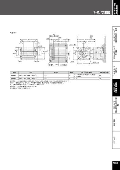 1-2.寸法図サーボモータ用高精度減速機オプション技術資料AF3タイプ同心中空軸・同心中実軸AFCタイプ中空軸・中実軸AH2タイプ直交軸APG/AG3タイプ平行軸モータマッチング・容量形状種別一覧表<図4>φ28H8φ44φ7530161619437228φ28H8φ44φ110h7(φ96.5)82保護キャップ取り付け時13.546.5146113.567195(260)250165.560105.58フランジ面31.3120041φ213保護キャップF3S-30(付属品)2-M61204-M8深さ20容量型式減速比2000WAFCZ28S-***□2000△3,5図番42000W3,5AFCZ28S-***□2000△4※型式の***には減速比が入ります。また、□にはバックラッシ精度、△にはフランジ形状種別が入ります。※フランジ種別記号はモータマッチング・容量形状種別一覧表P.978~P.985をご参照ください。※入力軸部詳細寸法はP.1141~P.1147をご参照ください。※濃色はフランジ形状種別K75の外寸図です。※性能表はP.1052をご参照ください。フランジ形状種別概略質量(kg)K13・K21・K22・K23・K31・K32・K33・K41K758.89.81063