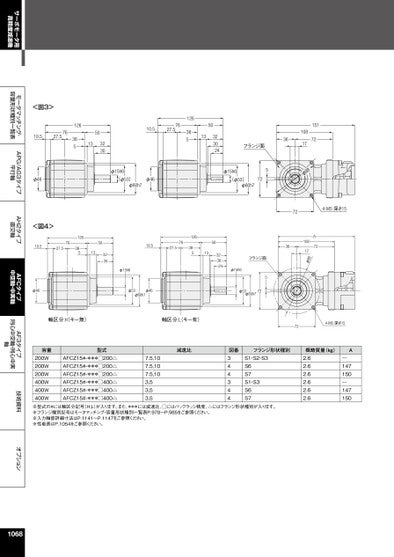 サーボモータ用高精度減速機モータマッチング・容量形状種別一覧表APG/AG3タイプ平行軸AH2タイプ直交軸AFCタイプ中空軸・中実軸AF3タイプ同心中空軸・同心中実軸技術資料オプション<図3>10.57627.51263855013323010.57627.51263851350323024フランジ面36φ46φ15h6(φ53)φ60h7φ46φ15h65(φ53)φ60h772151721081788φ<図4>10.57627.5φ4612638550133230φ15h610.57627.51263855013φ53φ46φ60h7724-M5深さ1536A721081788φ323024φ15h6フランジ面5φ53φ60h772軸区分:H(キー無)軸区分:L(キー有)724-M5深さ15減速比容量200W200W200W400W400W400W型式AFCZ15#-***□200△AFCZ15#-***□200△AFCZ15#-***□200△AFCZ15#-***□400△AFCZ15#-***□400△AFCZ15#-***□400△7.5,107.5,107.5,103,53,53,5図番344344フランジ形状種別概略質量(kg)AS1・S2・S3S6S7S1・S3S6S72.62.62.62.62.62.6―147150―147150※型式の#には軸区分記号(H,L)が入ります。また、***には減速比、□にはバックラッシ精度、△にはフランジ形状種別が入ります。※フランジ種別記号はモータマッチング・容量形状種別一覧表P.978~P.985をご参照ください。※入力軸部詳細寸法はP.1141~P.1147をご参照ください。※性能表はP.1054をご参照ください。1068