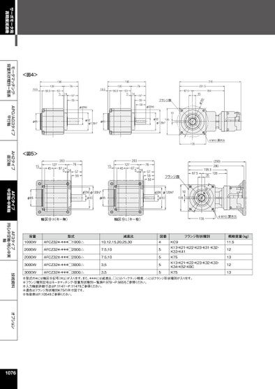 サーボモータ用高精度減速機モータマッチング・容量形状種別一覧表APG/AG3タイプ平行軸AH2タイプ直交軸AFCタイプ中空軸・中実軸AF3タイプ同心中空軸・同心中実軸技術資料オプション<図4>10.512056.519653514765755φ85<図5>10.512056.5φ32h6φ92φ120h7φ851965351476575550フランジ面φ32h61067.5316164231.535061φφ92135φ120h74-M10深さ2513515127452036751476575515127452036751476575550(290)28012867.5195.535フランジ面φ32h6φ120h7(φ105.5)φ85φ32h6φ120h7(φ105.5)10135φ160軸区分:H(キー無)軸区分:L(キー有)1354-M10深さ25型式減速比AFCZ32#-***□1000△10,12,15,20,25,30AFCZ32#-***□2000△AFCZ32#-***□2000△AFCZ32#-***□3000△AFCZ32#-***□3000△7.5,107.5,103,53,5図番45555フランジ形状種別概略質量(kg)KC9K13・K21・K22・K23・K31・K32・K33・K41K75K13・K21・K22・K23・K32・K33・K34・K52・KBCK7511.512131213φ85容量1000W2000W2000W3000W3000W※型式の#には軸区分記号(H,L)が入ります。また、***には減速比、□にはバックラッシ精度、△にはフランジ形状種別が入ります。※フランジ種別記号はモータマッチング・容量形状種別一覧表P.978~P.985をご参照ください。※入力軸部詳細寸法はP.1141~P.1147をご参照ください。※濃色はフランジ形状種別K75の外寸図です。※性能表はP.1054をご参照ください。1076