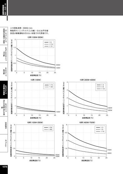 モータマッチング・容量形状種別一覧表APG/AG3タイプ平行軸AH2タイプ直交軸AFCタイプ中空軸・中実軸AF3タイプ同心中空軸・同心中実軸技術資料オプションサーボモータ用高精度減速機15枠(200W・400W)1/31/51/10400W200W510152025減速機温度(℃)18枠(400W・750W)1/31/51/10750W400W510152025減速機温度(℃)432100起動時無負荷ランニングトルク(入力軸)(N・m)64.531.500起動時無負荷ランニングトルク(入力軸)N・m)12枠(100W・200W)1/51/7.51/10200W100W510152025減速機温度(℃)15枠(100W)1/151/30100W510152025減速機温度(℃)18枠(100W・200W)1/301/60510152025減速機温度(℃)200W100W21.510.500432100起動時無負荷ランニングトルク(入力軸)N・m)起動時無負荷ランニングトルク(入力軸)(N・m)64.531.500起動時無負荷ランニングトルク(入力軸)N・m)入力回転速度:3000r/min無負荷ランニングトルク(入力軸):0.5-3s平均値各図は暖機運転を行わない状態での代表値です。1078