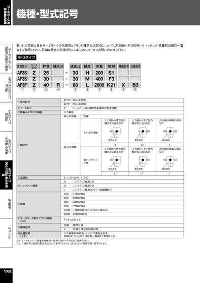 サーボモータ用高精度減速機モータマッチング・容量形状種別一覧表APG/AG3タイプ平行軸AH2タイプ直交軸AFCタイプ中空軸・中実軸AF3タイプ同心中空軸・同心中実軸技術資料オプション機種・型式記号取り付け可能な各社サーボモータの代表例とフランジ種別対応区分についてはP.986~P.992モータマッチング・容量形状種別一覧表をご参照ください。詳細は最寄の営業所もしくはCSセンターまでお問い合わせください。補助記号仕様記号X⑨B3⑩容量2004002000⑦種別S1F3K21⑧HML⑥303060⑤R④軸区分減速比精度AF3S:同心中空軸AF3F:同心中実軸Z出力軸径同心中空軸空欄:サーボモータ用高精度減速機(Z型減速機)枠番253040③AF3タイプモータ区分ZZZ②取付区分AF3SAF3SAF3F①①取付区分②モータ区分③枠番および出力軸径④軸区分同心中実軸1分・3分仕様低バックラッシ仕様入力側から見て出力軸が左に出るもの入力側から見て出力軸が右に出るもの出力軸が両側に出るもの製品銘板H製品銘板M製品銘板F入力側から見て出力軸が左に出るもの入力側から見て出力軸が右に出るもの出力軸が両側に出るもの製品銘板L製品銘板R製品銘板T⑤減速比⑥バックラッシ精度⑦容量:バックラッシ精度1分:バックラッシ精度3分:バックラッシ精度30分(一部機種除く):100W相当:200W相当:400W相当:750W相当5:1/5~240:1/240HML1002004007501000:1000W相当(1分・3分仕様のみ)2000:2000W相当⑧サーボモータ取付フランジ種別(注1)F1,S1,K31など⑨補助記号⑩仕様記号(注2):標準仕様:特殊仕様追加認識記号空欄X入力軸継手締結用レンチ穴位置指示記号詳細はP.1184の仕様記号一覧表をご参照ください。注1.モータマッチング容量形状種別一覧表P.986~P.992をご参照ください。注2.仕様記号は銘板の製品型式名には表示されません。銘板上の仕様記号欄に表示されます。1082