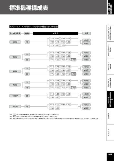 標準機種構成表サーボモータ用高精度減速機オプション技術資料AF3タイプ同心中空軸・同心中実軸AFCタイプ中空軸・中実軸AH2タイプ直交軸APG/AG3タイプ平行軸モータマッチング・容量形状種別一覧表標準機種構成表AF3タイプ<AF3S>バックラッシ精度1分・3分仕様モータ相当容量枠番減速比100W200W400W750W1000W2000W1525303035354535451/101/151/201/251/301/401/501/601/751/901/1201/101/151/201/251/301/401/501/601/751/901/1201/1501/1801/101/151/201/251/301/401/501/601/751/901/1201/1501/1801/101/151/201/251/301/401/501/601/751/901/1201/1501/1801/101/201/301/401/501/601/101/201/301/401/501/60精度H(1分)M(3分)H(1分)M(3分)M(3分)H(1分)M(3分)M(3分)H(1分)M(3分)M(3分)H(1分)M(3分)H(1分)M(3分)注1.はトルク制限機種です。性能表の出力軸許容トルクに特にご注意ください。注2.低バックラッシ仕様(精度30分~)の機種構成表はP.1085をご参照ください。注3.精度記号H・M(バックラッシ1分・3分)製品と、精度記号L(低バックラッシ仕様)製品とでは、出力詳細などが異なりますので、寸法図にてご確認ください。1083