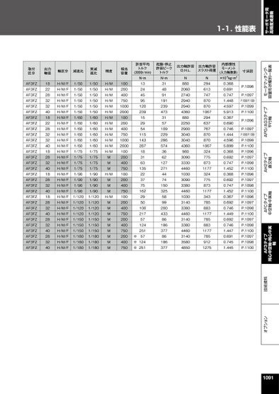 1-1.性能表サーボモータ用高精度減速機オプション技術資料AF3タイプ同心中空軸・同心中実軸AFCタイプ中空軸・中実軸AH2タイプ直交軸APG/AG3タイプ平行軸モータマッチング・容量形状種別一覧表取付区分出力軸径軸区分減速比AF3FZAF3FZAF3FZAF3FZAF3FZAF3FZAF3FZAF3FZAF3FZAF3FZAF3FZAF3FZAF3FZAF3FZAF3FZAF3FZAF3FZAF3FZAF3FZAF3FZAF3FZAF3FZAF3FZAF3FZAF3FZAF3FZAF3FZAF3FZAF3FZAF3FZ182228323240182228323240182832401828324018283240283240283240H/M/FH/M/FH/M/FH/M/FH/M/FH/M/FH/M/FH/M/FH/M/FH/M/FH/M/FH/M/FH/M/FH/M/FH/M/FH/M/FH/M/FH/M/FH/M/FH/M/FH/M/FH/M/FH/M/FH/M/FH/M/FH/M/FH/M/FH/M/FH/M/FH/M/F1/501/501/501/501/501/501/601/601/601/601/601/601/751/751/751/751/901/901/901/901/1201/1201/1201/1201/1501/1501/1501/1801/1801/180実減速比1/501/501/501/501/501/501/601/601/601/601/601/601/751/751/751/751/901/901/901/901/1201/1201/1201/1201/1501/1501/1501/1801/1801/180精度H/MH/MH/MH/MH/MH/MH/MH/MH/MH/MH/MH/MH/MMMMH/MMMMH/MMMMMMMMMM相当容量1002004007501000200010020040075010002000100200400750100200400750100200400750200400750200400750許容平均トルク(3000r/min)N・m13244595120239152954115143287183163135223775162295010021757124251※57※124※251起動・停止許容ピークトルクN・m31489119123947331571092292865743662127271447415032558992004338618637786186377出力軸許容O.H.L.出力軸許容スラスト荷重N880206027402940294043608802250290030403040436098030903330446010303090338044601030314033804460314033804460314035804850N2946137478708701067294637767870870106732477587311773247758731177343785883117778588311777859121275内部慣性モーメント(入力軸換算)×10-4kg・m20.3680.6910.7471.4484.5975.9130.3670.6900.7461.4444.5965.8990.3680.6920.7471.4520.3680.6920.7471.4520.3670.6920.7461.4490.6920.7461.4470.6910.7451.445寸法図P.1096P.1097P.1098/P.099P.1099P.1100P.1096P.1097P.1098/P.099P.1099P.1100P.1096P.1097P.1098P.1100P.1096P.1097P.1098P.1100P.1096P.1097P.1098P.1100P.1097P.1098P.1100P.1097P.1098P.11001091