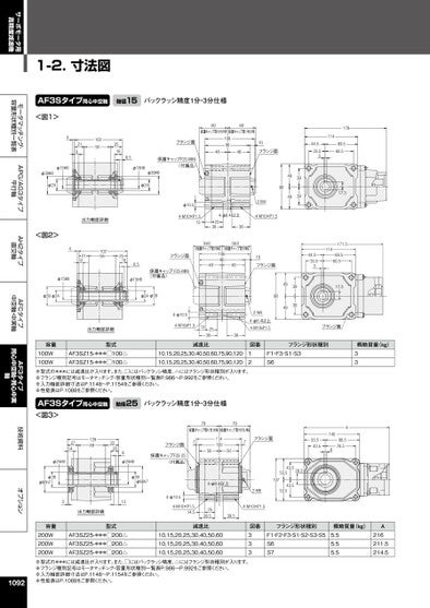 サーボモータ用高精度減速機モータマッチング・容量形状種別一覧表APG/AG3タイプ平行軸AH2タイプ直交軸AFCタイプ中空軸・中実軸AF3タイプ同心中空軸・同心中実軸技術資料オプション1-2.寸法図AF3Sタイプ同心中空軸軸径15バックラッシ精度1分・3分仕様<図1>42191025625166060保護キャップ取り付け時保護キャップ取り付け時フランジ面10696484810フランジ面φ15H8φ39H8φ246.5φ15H8保護キャップF2S-MINI(付属品)φ39H8φ24出力軸部詳細<図2>4219102562516φ15H8φ39φ24フランジ面6.5φ15H8保護キャップF2S-MINI(付属品)φ24φ39出力軸部詳細型式4-φ10.54-M10xP1.513253838減速比AF3SZ15-***□100△AF3SZ15-***□100△10,15,20,25,30,40,50,60,75,90,12010,15,20,25,30,40,50,60,75,90,120容量100W100W※型式の***には減速比が入ります。また、□にはバックラッシ精度、△にはフランジ形状種別が入ります。※フランジ種別記号はモータマッチング・容量形状種別一覧表P.986~P.992をご参照ください。※入力軸部詳細寸法はP.1148~P.1154をご参照ください。※性能表はP.1088をご参照ください。AF3Sタイプ同心中空軸<図3>軸径25バックラッシ精度1分・3分仕様17611469.560.544.535.5598493949392-M417.34-φ8.4以上4-M10×P1.5253838φ10.54-M10×P1.513(60)(60)(保護キャップ取付時)(保護キャップ取付時)10696484810フランジ面171.511469.560.544.535.5517.3フランジ面98494939392-M44-φ8.4以上4-M10xP1.5図番12フランジ形状種別概略質量(kg)F1・F3・S1・S3S6337979保護キャップ取り付け時保護キャップ取り付け時2714129693320フランジ面78φ25H8保護キャップF3S-25(付属品)1141005050フランジ面7A140886.576.553.543.5φ25H8φ39φ66h7213出力軸部詳細容量200W200W200W型式AF3SZ25-***□200△AF3SZ25-***□200△AF3SZ25-***□200△φ39φ66h74-φ10.54-M10×P1.514.54-φ8.4以上2539.539.5減速比10,15,20,25,30,40,50,6010,15,20,25,30,40,50,6010,15,20,25,30,40,50,602-M64-M10×P1.5図番33343.553.528.310743.553.5フランジ形状種別概略質量(kg)F1・F2・F3・S1・S2・S3・S5S6S75.55.55.5A216211.5214.5※型式の***には減速比が入ります。また、□にはバックラッシ精度、△にはフランジ形状種別が入ります。※フランジ種別記号はモータマッチング・容量形状種別一覧表P.986~P.992をご参照ください。※入力軸部詳細寸法はP.1148~P.1154をご参照ください。※性能表はP.1088をご参照ください。1092