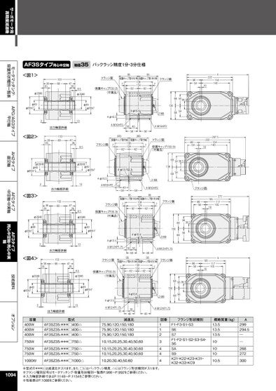 サーボモータ用高精度減速機モータマッチング・容量形状種別一覧表APG/AG3タイプ平行軸AH2タイプ直交軸AFCタイプ中空軸・中実軸AF3タイプ同心中空軸・同心中実軸技術資料オプションAF3Sタイプ同心中空軸軸径35バックラッシ精度1分・3分仕様3820153684726フランジ面8.5φ35H8保護キャップF3S-35(付属品)95保護キャップ取り付け時95保護キャップ取り付け時713812462627フランジ面6854222A15414010<図1>φ35H8φ49φ85h7213出力軸部詳細<図2>15368382047268.5φ49φ85h74-φ16.54-M16×P2685438.31364-φ10.42-M85468184058584-M16×P2(95)(95)(保護キャップ取付時)保護キャップ取付時)フランジ面フランジ面7621381247保護キャップF3S-35(付属品)62φ35H8φ49φ85h7φ35H8φ49φ85h7213出力軸部詳細3820153684726<図3>φ35H8φ49φ85h7φ49φ85h74-φ13.7以上4-φ16.54-M16×P2184058582-M84-M16×P295保護キャップ取り付け時95保護キャップ取り付け時フランジ面78.5φ35H8保護キャップF3S-35(付属品)13812462627213出力軸部詳細4-φ12.54-M12×P1.754-φ10.42-M8183048484-M12×P1.75685438.31365468フランジ面5638.35613668686854297.515414022210フランジ面6856272117105185103820153684726フランジ面95保護キャップ取り付け時95保護キャップ取り付け時フランジ面8.5φ35H8保護キャップF3S-35(付属品)7138124626276856A18510117105φ49φ85h7685638.31364-φ12.54-M12×P1.75184-φ10.42-M856683048484-M12×P1.75<図4>φ35H8φ49φ85h7213出力軸部詳細容量400W400W400W750W750W750W型式AF3SZ35-***□400△AF3SZ35-***□400△AF3SZ35-***□400△AF3SZ35-***□750△AF3SZ35-***□750△AF3SZ35-***□750△減速比75,90,120,150,18075,90,120,150,18075,90,120,150,18010,15,20,25,30,40,50,6010,15,20,25,30,40,50,6010,15,20,25,30,40,50,60図番1123444フランジ形状種別概略質量(kg)F1・F3・S1・S3S6S7F1・F2・S1・S2・S3・S4・S6SAS9K21・K22・K23・K31・K32・K33・KC913.513.513.510101010.5A299294.5――2682723001000WAF3SZ35-***□1000△10,20,30,40,50,601094※型式の***には減速比が入ります。また、□にはバックラッシ精度、△にはフランジ形状種別が入ります。※フランジ種別記号はモータマッチング・容量形状種別一覧表P.986~P.992をご参照ください。※入力軸部詳細寸法はP.1148~P.1154をご参照ください。※性能表はP.1088をご参照ください。