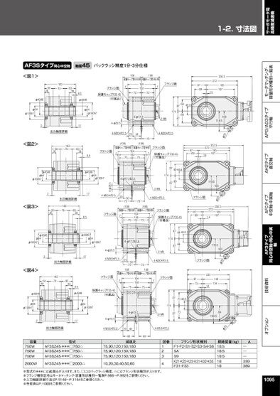 1-2.寸法図サーボモータ用高精度減速機オプション技術資料AF3タイプ同心中空軸・同心中実軸AFCタイプ中空軸・中実軸AH2タイプ直交軸APG/AG3タイプ平行軸モータマッチング・容量形状種別一覧表119.5103φ20356.518516727214フランジ面8769フランジ面119.5103φ20A87732351414813484100.5φ20AF3Sタイプ同心中空軸軸径45バックラッシ精度1分・3分仕様<図1>φ45H8φ64φ100h750261837063398.5φ45H8φ64φ100h7217出力軸部詳細108保護キャップ取り付け時108保護キャップ取り付け時フランジ面7保護キャップF3S-45(付属品)1641507575フランジ面7356.51851672721487696948.88717469872-M84-φ17.24-φ20.54-M20×P2.5235073734-M20×P2.5103119.5φ20<図2>5026183706339フランジ面8.5(108)(108)(保護キャップ取付時)(保護キャップ取付時)フランジ面716415075757保護キャップF3S-45(付属品)8769352.518516727214876948.817469872-M84-M20×P2.52出力軸部詳細174-M20×P2.5235073734-φ17.2以上4-φ20.5φ45H8φ64φ100h7φ45H8φ64φ100h7<図3>18370502663398.5フランジ面(108)(108)(保護キャップ取付時)(保護キャップ取付時)フランジ面716415075757保護キャップF3S-45(付属品)φ45H8φ64φ100h725026<図4>φ45H8φ64φ100h7φ45H8φ64φ100h7出力軸部詳細17876948.817469874-φ20.54-M20×P2.54-φ17.2以上235073732-M84-M20×P2.5183706339フランジ面8.5φ45H8保護キャップF3S-45(付属品)108108保護キャップ取り付け時保護キャップ取り付け時716415075757フランジ面877348.81742-M87387φ64φ100h74-φ13.74-φ16.5217出力軸部詳細4-M16×P2.023404-M16×P2.0容量750W750W750W型式AF3SZ45-***□750△AF3SZ45-***□750△AF3SZ45-***□750△6363減速比75,90,120,150,18075,90,120,150,18075,90,120,150,1802000WAF3SZ45-***□2000△10,20,30,40,50,60図番1234フランジ形状種別F1・F2・S1・S2・S3・S4・S6SAS9K21・K22・K23・K31・K32・K33F31・F33概略質量(kg)18.518.518.51818A―――359369※型式の***には減速比が入ります。また、□にはバックラッシ精度、△にはフランジ形状種別が入ります。※フランジ種別記号はモータマッチング・容量形状種別一覧表P.986~P.992をご参照ください。※入力軸部詳細寸法はP.1148~P.1154をご参照ください。※性能表はP.1088をご参照ください。1095