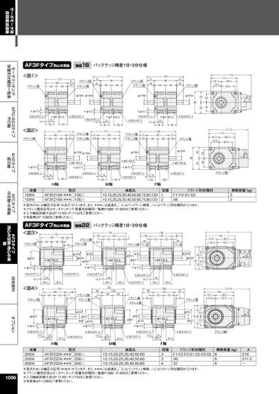 サーボモータ用高精度減速機モータマッチング・容量形状種別一覧表APG/AG3タイプ平行軸AH2タイプ直交軸AFCタイプ中空軸・中実軸AF3タイプ同心中空軸・同心中実軸技術資料オプションAF3Fタイプ同心中実軸軸径18バックラッシ精度1分・3分仕様<図1>フランジ面4812796483130フランジ面フランジ面3130127964848フランジ面フランジ面31301589648483130フランジ面11417669.560.544.535.5φ18h6φ18h6φ18h6132538158964848383130フランジ面171.511469.560.544.535.5フランジ面3949394998φ18h64-φ8.4以上4-M10xP1.513253838F軸フランジ面フランジ面3130φ18h64-φ8.4以上4-φ10.54-M10xP1.54-M10xP1.5φ18h698493949394-φ8.4以上4-M10×P1.54-φ10.54-M10×P1.54-M10×P1.54-φ10.54-M10×P1.513<図2>フランジ面4-φ8.4以上2538483812796484-M10×P1.54-φ10.54-M10×P1.5133130フランジ面フランジ面31304-φ8.4以上253838127964848φ18h6φ18h64-φ8.4以上4-φ10.54-M10xP1.54-M10xP1.513253838M軸4-φ10.54-M10xP1.513253838H軸容量100W100W型式AF3FZ18#-***□100△AF3FZ18#-***□100△減速比10,15,20,25,30,40,50,60,75,90,12010,15,20,25,30,40,50,60,75,90,120図番12フランジ形状種別F1・F3・S1・S3S6概略質量(kg)33※型式の#には軸区分記号(H,M,F)が入ります。また、***には減速比、□にはバックラッシ精度、△にはフランジ形状種別が入ります。※フランジ種別記号はモータマッチング・容量形状種別一覧表P.986~P.992をご参照ください。※入力軸部詳細寸法はP.1148~P.1154をご参照ください。※性能表はP.1090をご参照ください。AF3Fタイプ同心中実軸<図3>1557フランジ面100505048740フランジ面フランジ面軸径22バックラッシ精度1分・3分仕様487401551005050748740フランジ面フランジ面φ22h6φ22h6φ66h7φ66h74-φ10.54-M10×P1.54-M10×P1.54-φ8.4以上φ22h6φ66h7φ66h74-φ10.5196100505048740フランジ面4-φ8.4以上140A86.576.553.543.543.553.5φ22h6φ66h710743.553.5φ66h74-φ8.4以上4-φ10.54-M10×P1.514.5<図4>2539.5750フランジ面39.510015550φ66h74-φ8.4以上4-φ10.54-M10×P1.514.52539.51555039.51005014.5487404-φ8.4以上48740フランジ面フランジ面φ22h6φ66h7φ66h7φ22h64-φ10.54-M10×P1.514.54-M10×P1.52539.548740507フランジ面フランジ面39.519610050φ66h7φ66h7φ22h64-φ10.54-φ8.4以上4-M10×P1.548740フランジ面φ22h653.543.5107φ66h743.553.5140214.586.576.553.543.54-M10×P1.514.54-M10×P1.52539.539.54-M10×P1.5フランジ面2539.54-M10×P1.539.5H軸4-M10×P1.514.52539.539.5M軸容量200W200W200W型式AF3FZ22#-***□200△AF3FZ22#-***□200△AF3FZ22#-***□200△減速比10,15,20,25,30,40,50,6010,15,20,25,30,40,50,6010,15,20,25,30,40,50,60F軸図番334フランジ形状種別F1・F2・F3・S1・S2・S3・S5S6S7概略質量(kg)666A216211.5―1096※型式の#には軸区分記号(H,M,F)が入ります。また、***には減速比、□にはバックラッシ精度、△にはフランジ形状種別が入ります。※フランジ種別記号はモータマッチング・容量形状種別一覧表P.986~P.992をご参照ください。※入力軸部詳細寸法はP.1148~P.1154をご参照ください。※性能表はP.1090をご参照ください。